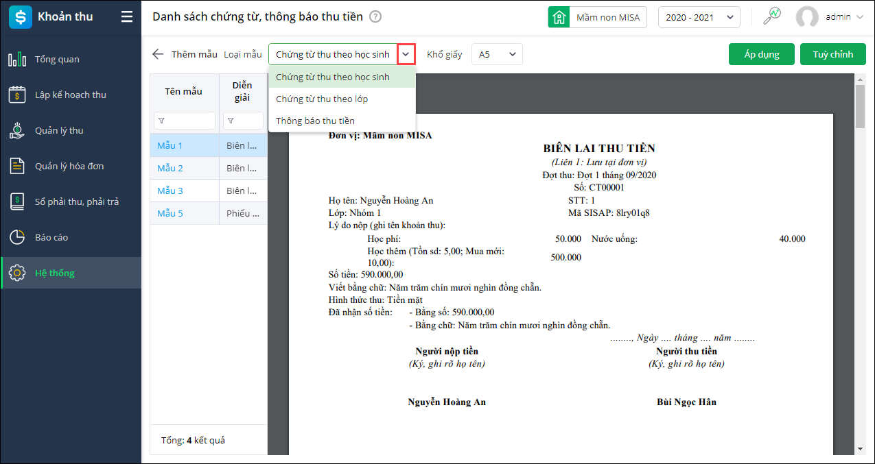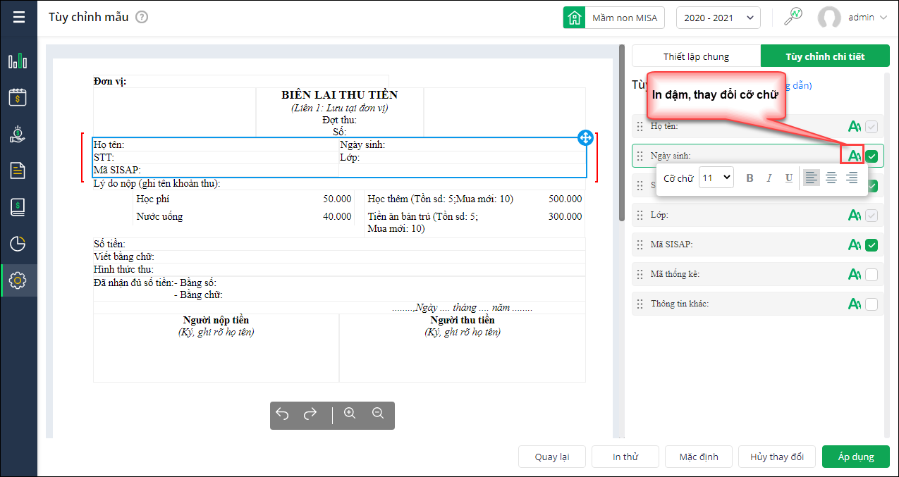 Xem hướng dẫn chi tiết tùy chỉnh mẫu chứng từ, thông thu tiền tại đây