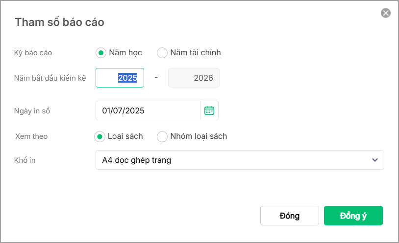 - Trên tham số báo cáo: Kỳ báo cáo, Năm bắt đầu kiểm kê, Hình thức xem báo cáo theo Loại sách/nhóm loại sách/Cấp học (đối với trường liên cấp) chọn In theo khổ thích hợp