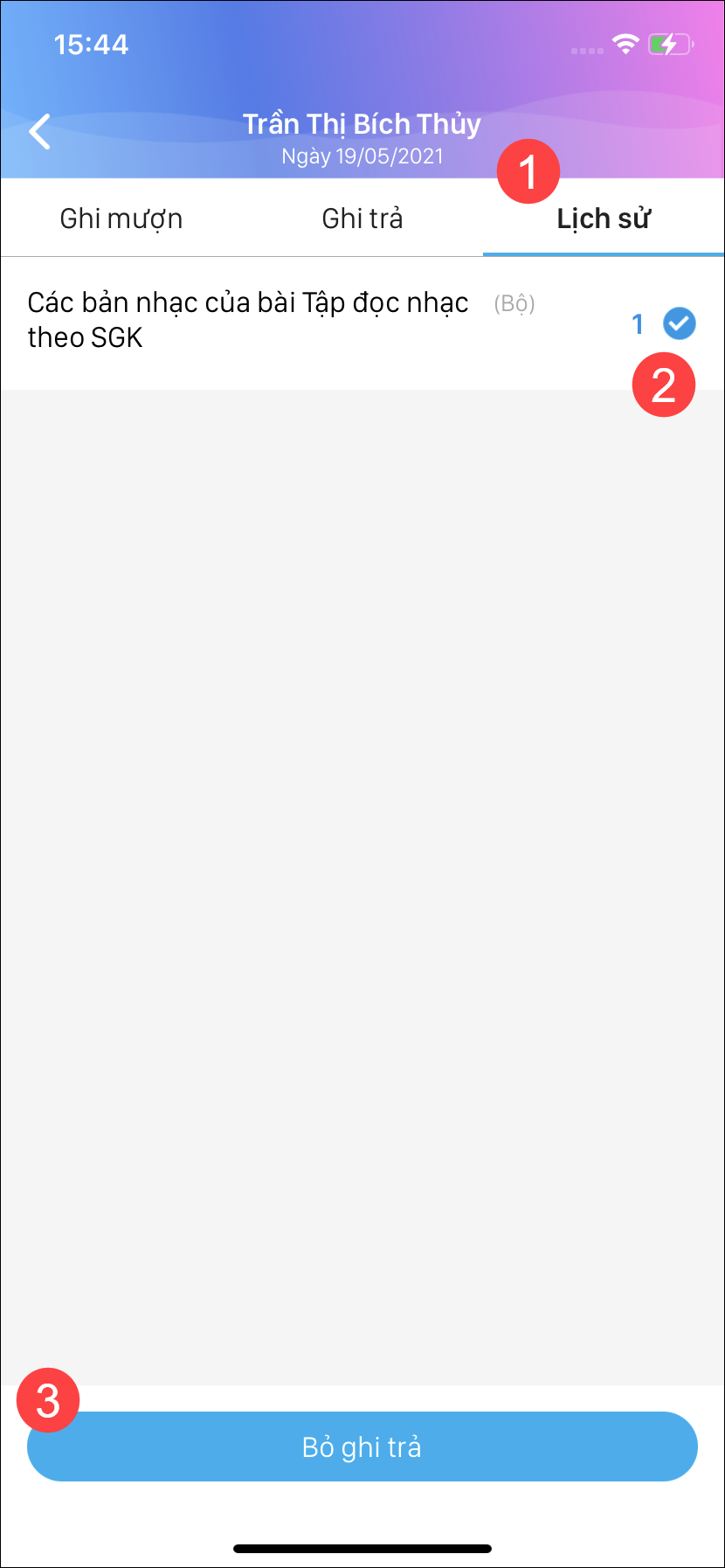 - Trường hợp muốn hủy ghi trả, anh/chị chạm tab Lịch sử/chọn thiết bị cần hủy ghi trả/nhấn Bỏ ghi trả