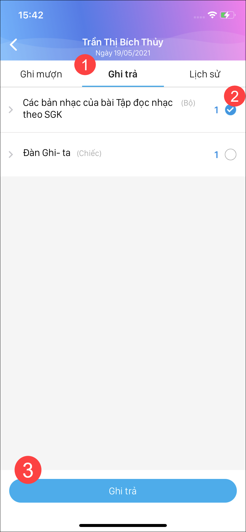 - Chọn phiếu mượn cần ghi trả, chạm tab Ghi trả