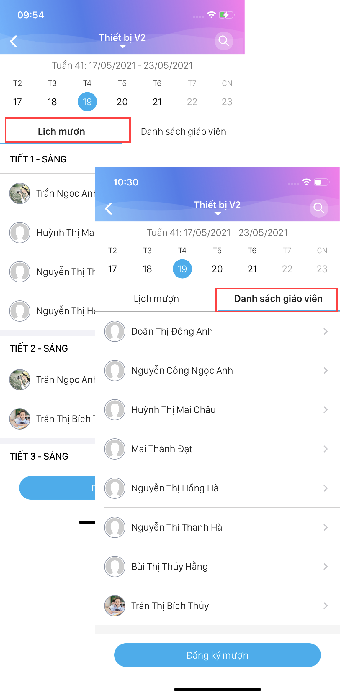 - Anh/chị nhanh chóng theo dõi kế hoạch mượn thiết bị theo trong ngày theo tiết học hoặc theo danh sách giáo viên.
