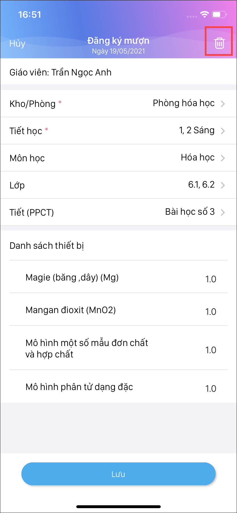 Lưu ý: Trường hợp muốn hủy kế hoạch mượn kho/phòng, anh/chị chạm biểu tượng “thùng rác” trên góc trên bên phải màn hình để xóa.