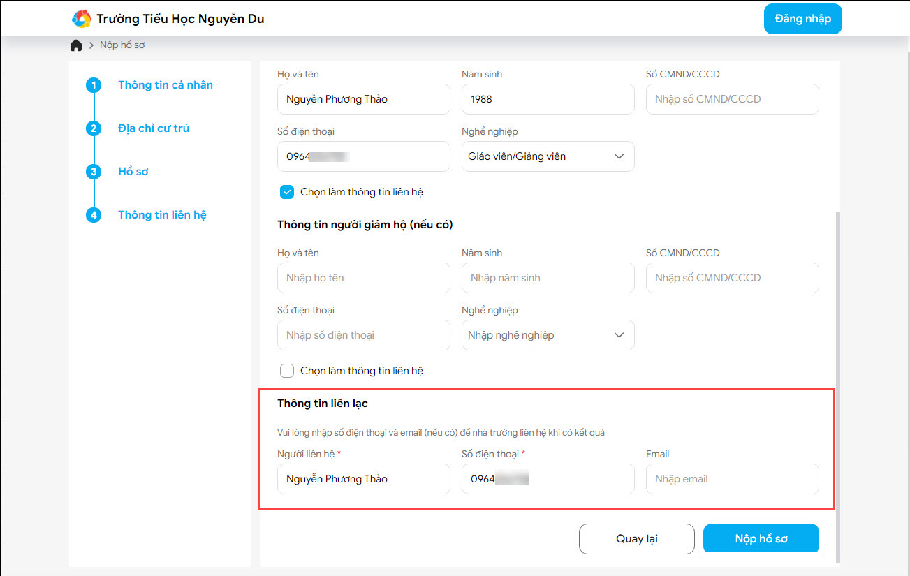 Lưu ý: Phụ huynh có thể sử dụng số điện thoại đã nhập khi khai báo Thông tin liên lạc trên hồ sơ tuyển sinh trực tuyến của con.