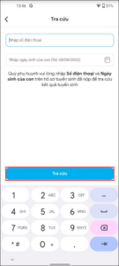 - Anh/chị nhập số điện thoại anh/chị khai báo tại mục Thông tin liên hệ trong hồ sơ tuyển sinh của con và ngày tháng năm sinh của con. Nhấn Tra cứu.
