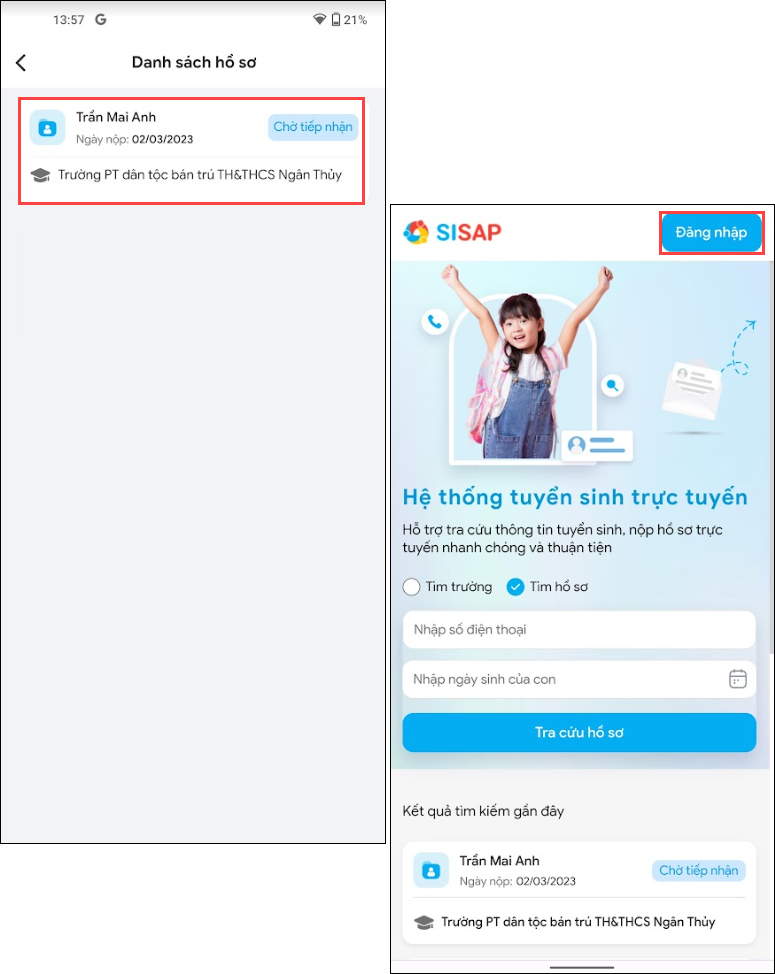 Mục đích: Giúp phụ huynh dễ dàng tra cứu để nắm bắt trạng thái hồ sơ tuyển sinh của con ngay trên ứng dụng SISAP Phụ huynh.