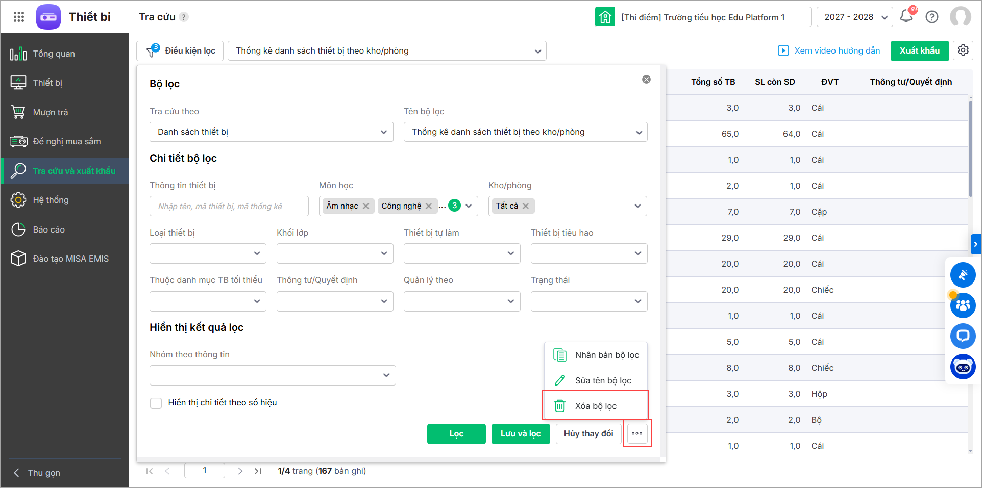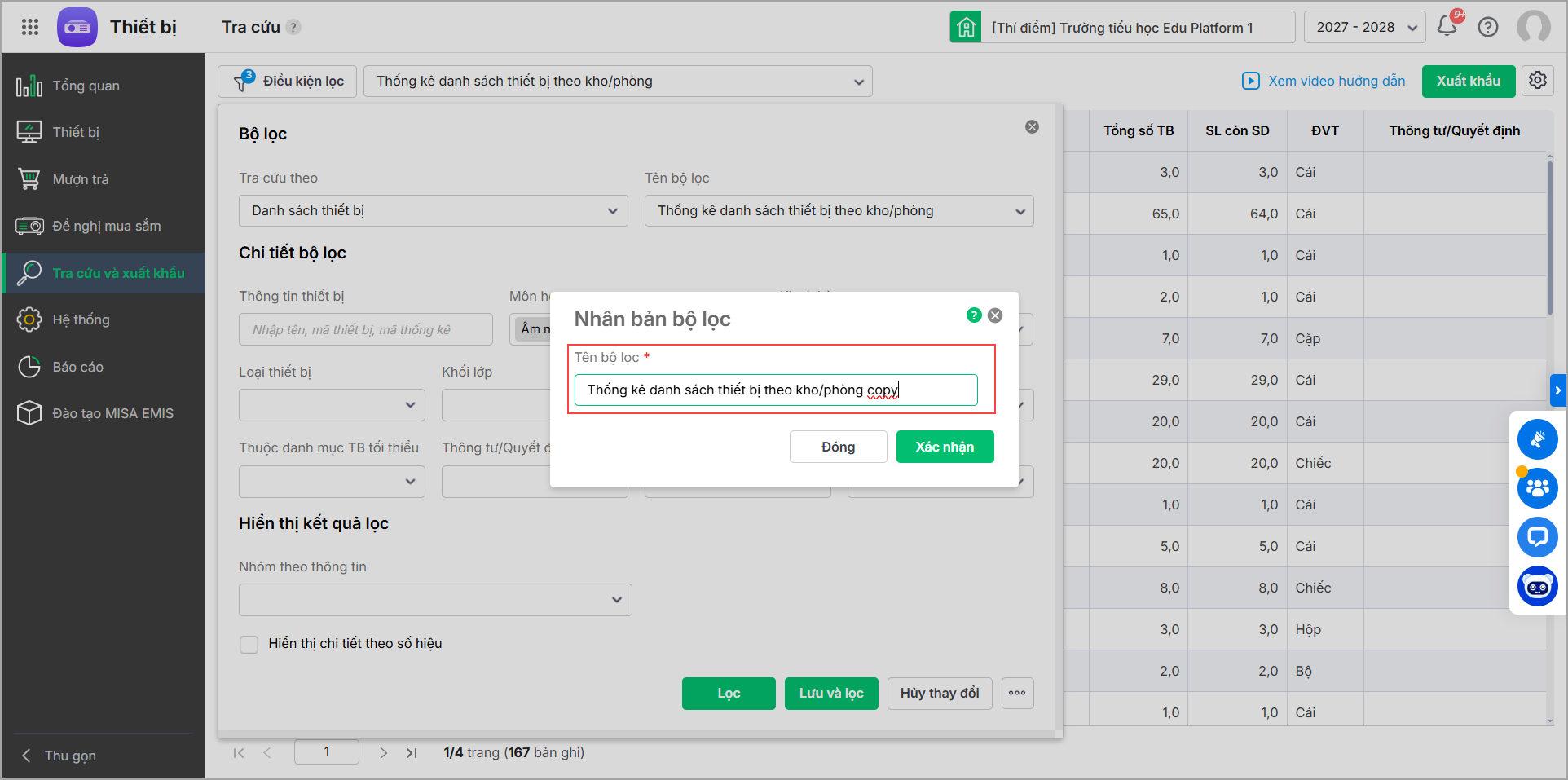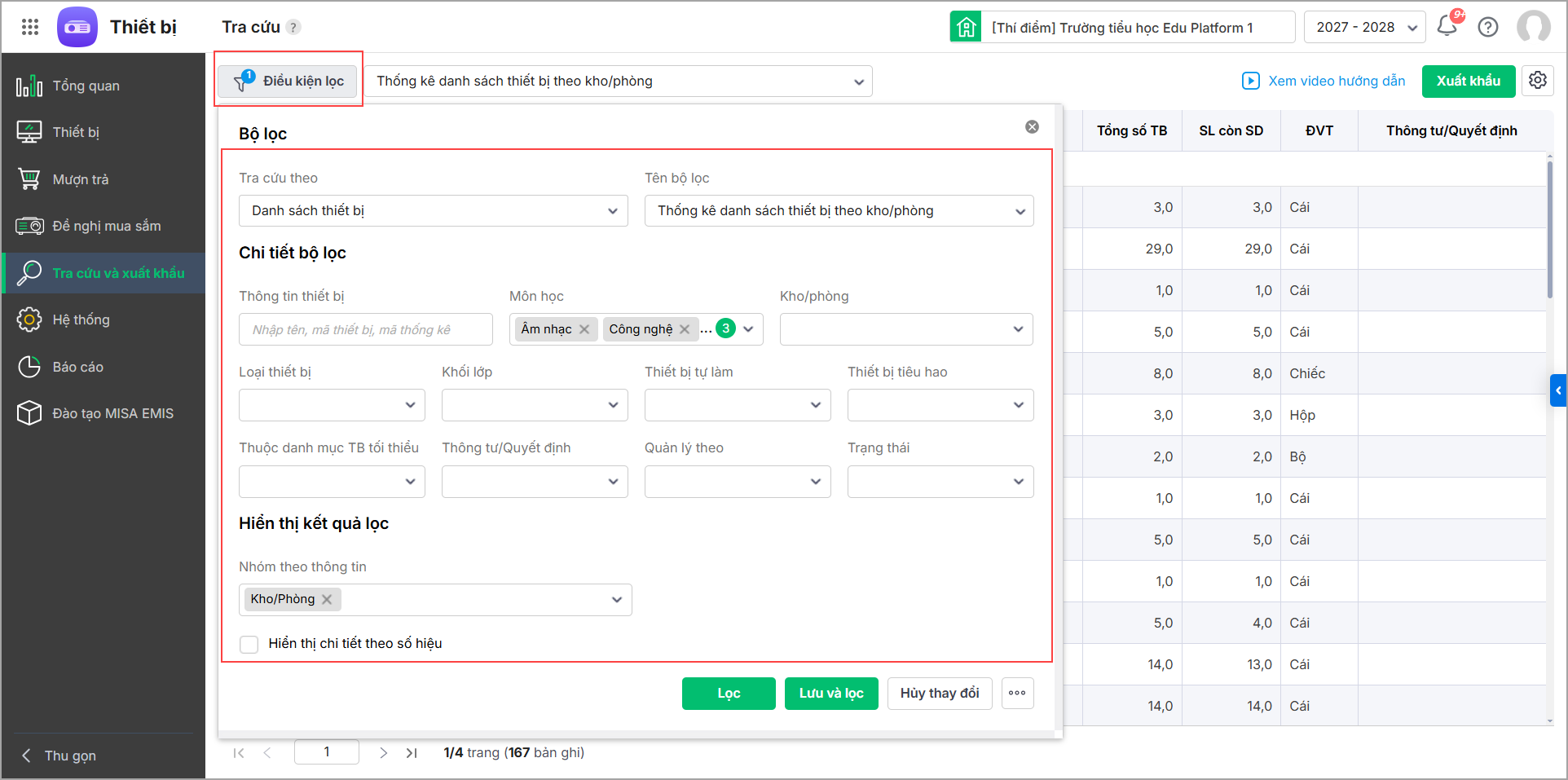 - Sau đó thay đổi các tiêu chí lọc cần tra cứu, nhấn Lọc để thực hiện tra cứu danh sách Thiết bị, nhấn Lưu và lọc để tra cứu đồng thời lưu các tiêu chí lọc vừa thay đổi cho bộ lọc mới nhân bản.