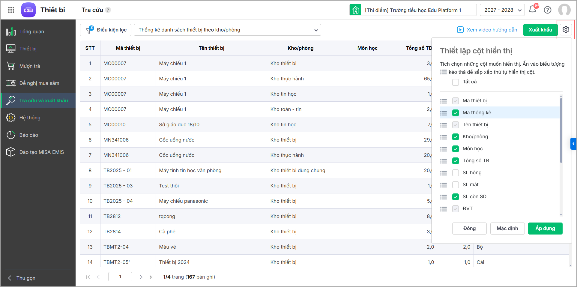 - Chọn các giá trị lọc theo nhu cầu tra cứu theo nhu cầu: Thông tin thiết bị, Môn học, Kho/phòng, Loại thiết bị, Khối lớp, TB tự làm, TB tiêu hao, Thuộc danh mục TB tối thiểu, Thông tư/Quyết định, Quản lý theo, Trạng thái