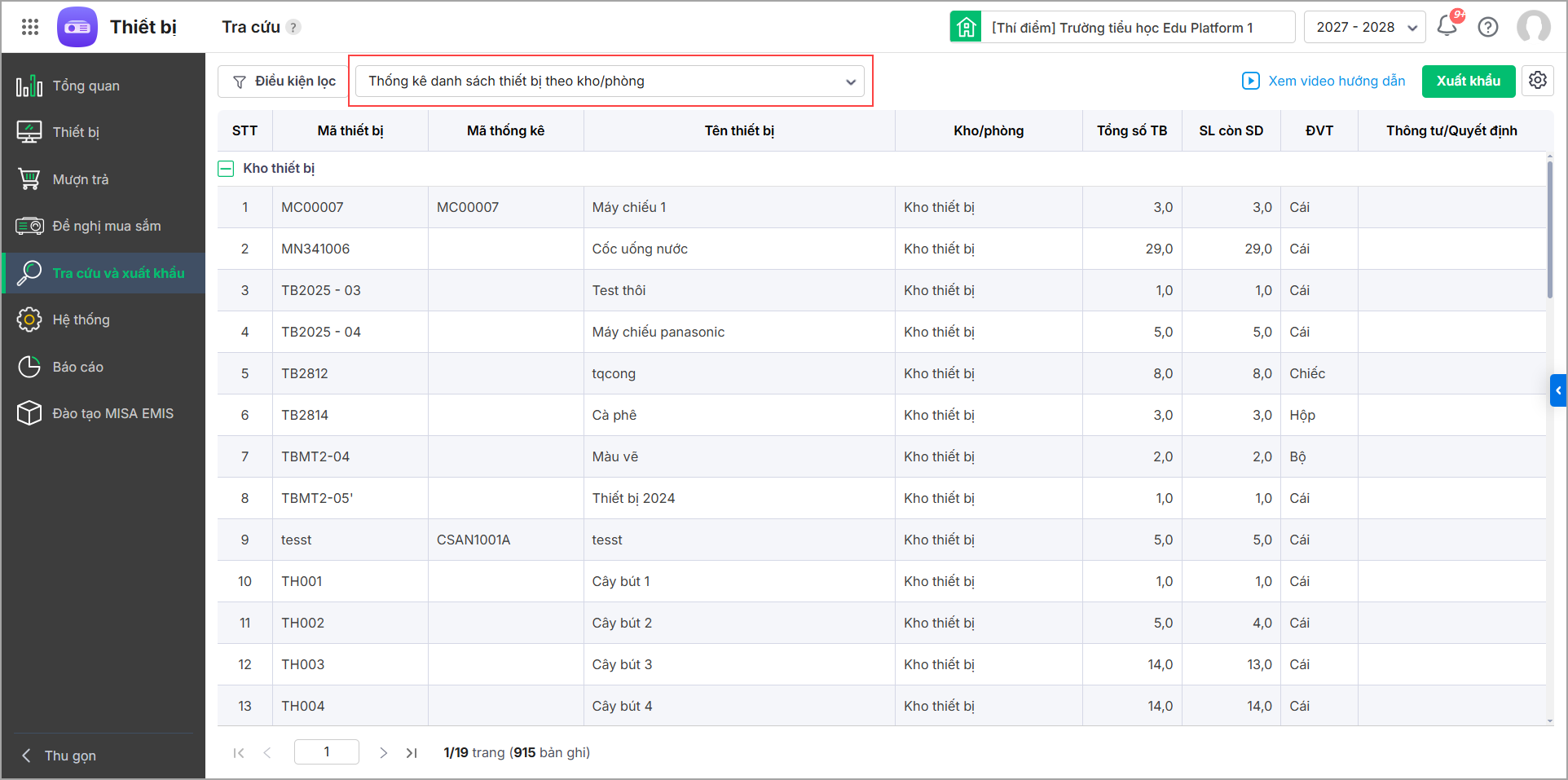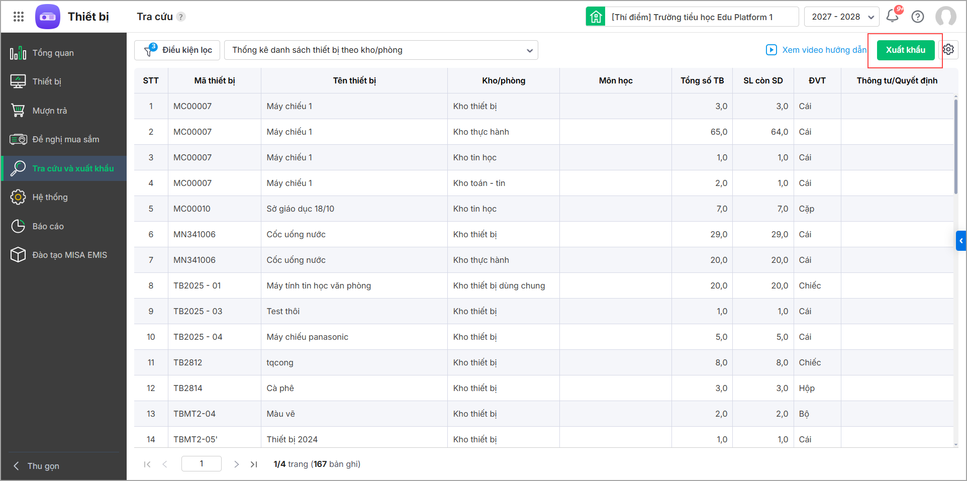 - Tại màn hình đang tra cứu, anh chị nhấn nút Xuất khẩu để xuất khẩu danh sách thiết bị ra file excel.