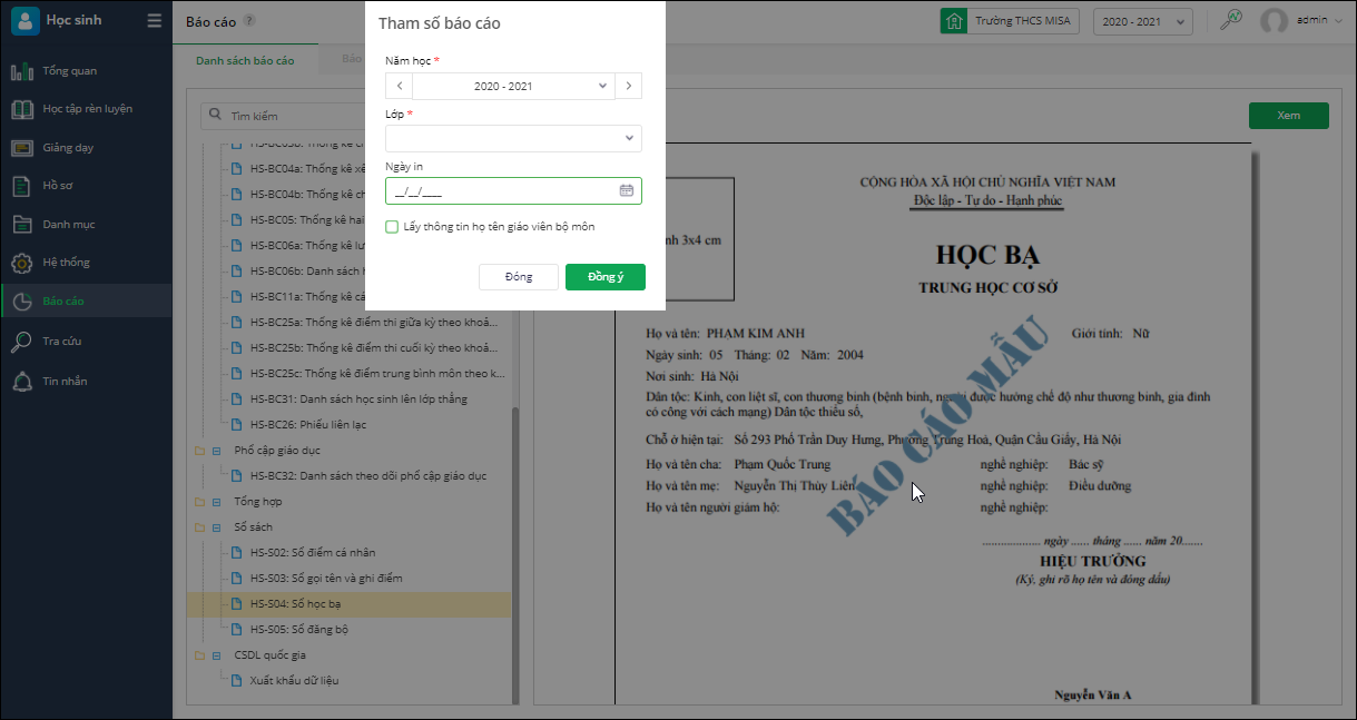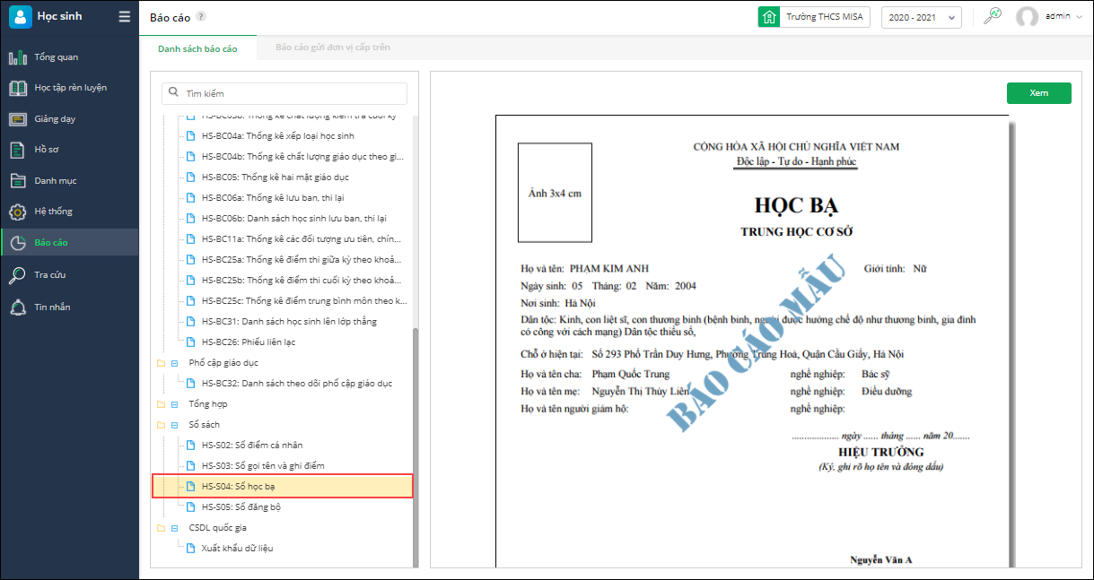 1. Vào Học sinh\Báo cáo\Sổ sách\HS-S04: Sổ học bạ
