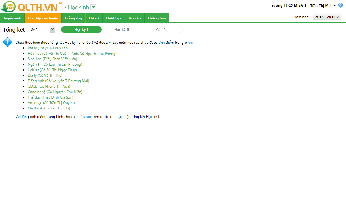 • Chọn Lớp thực hiện tổng kết học kỳ I. Lưu ý: Trường hợp các môn chưa được tính điểm TB môn thì phần mềm sẽ hiển thị thông báo để GV biết.