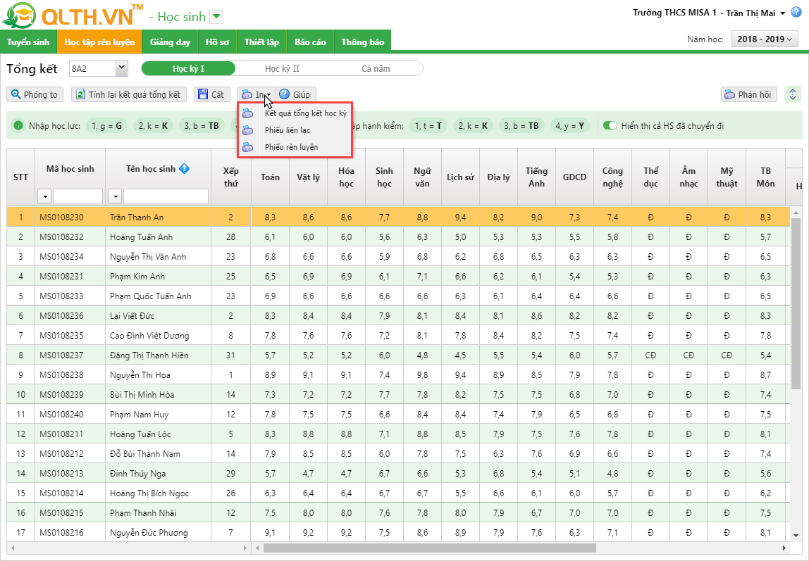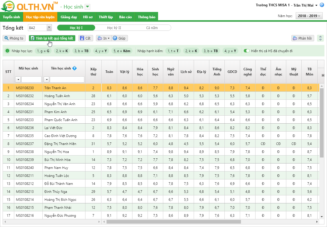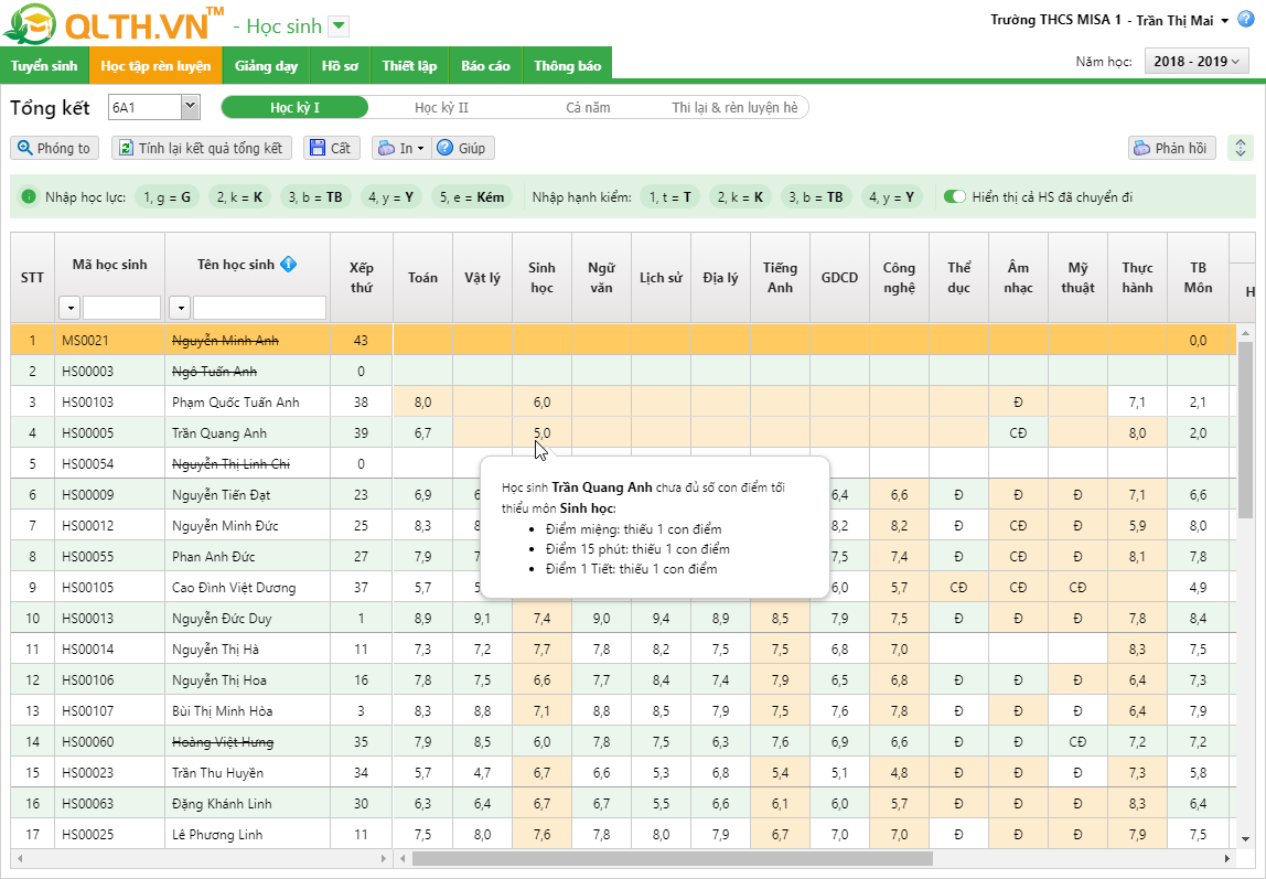 • Tại đây, phần mềm đã tự động thực hiện tổng kết cho toàn bộ học sinh trong lớp theo tiêu chí: