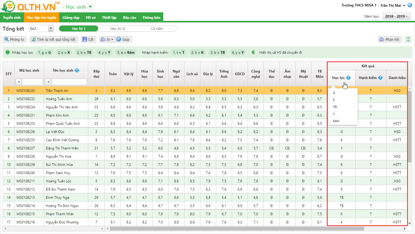 : Tại phần Kết quả – Học lực và Hạnh kiểm anh/chị có thể nhấn vào tiêu đề cột để chọn xếp loại cho toàn bộ học sinh trong lớp. Phần mềm đã đưa ra 1 số kí tự giúp anh.chị có thể nhập nhanh kết quả cho các học sinh trong lớp.