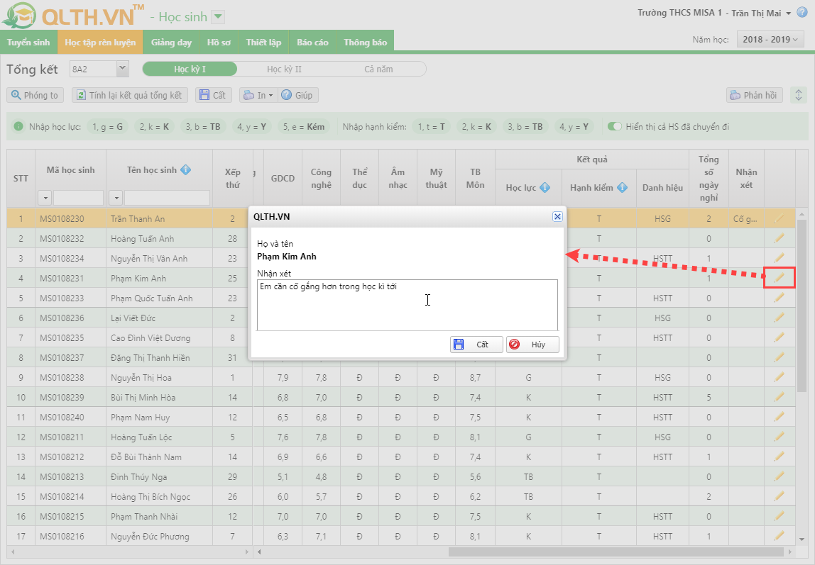 • Nhập trực tiếp tại cột Nhận xét để nhập nhận xét cho học sinh.