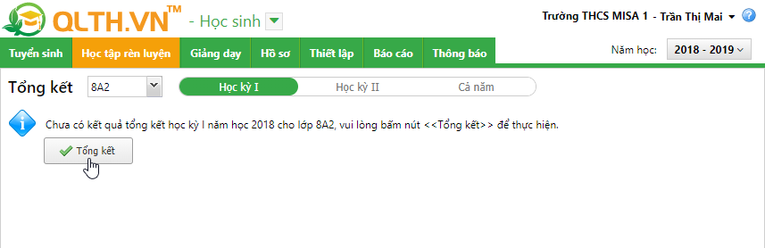 2. Nếu giáo viên có thực hiện sửa lại thông tin trên Sổ điểm cá nhấn thì anh/chị nhấn Tính lại kết quả tổng kết để phần mềm tính lại kết quả tổng kết cho học sinh