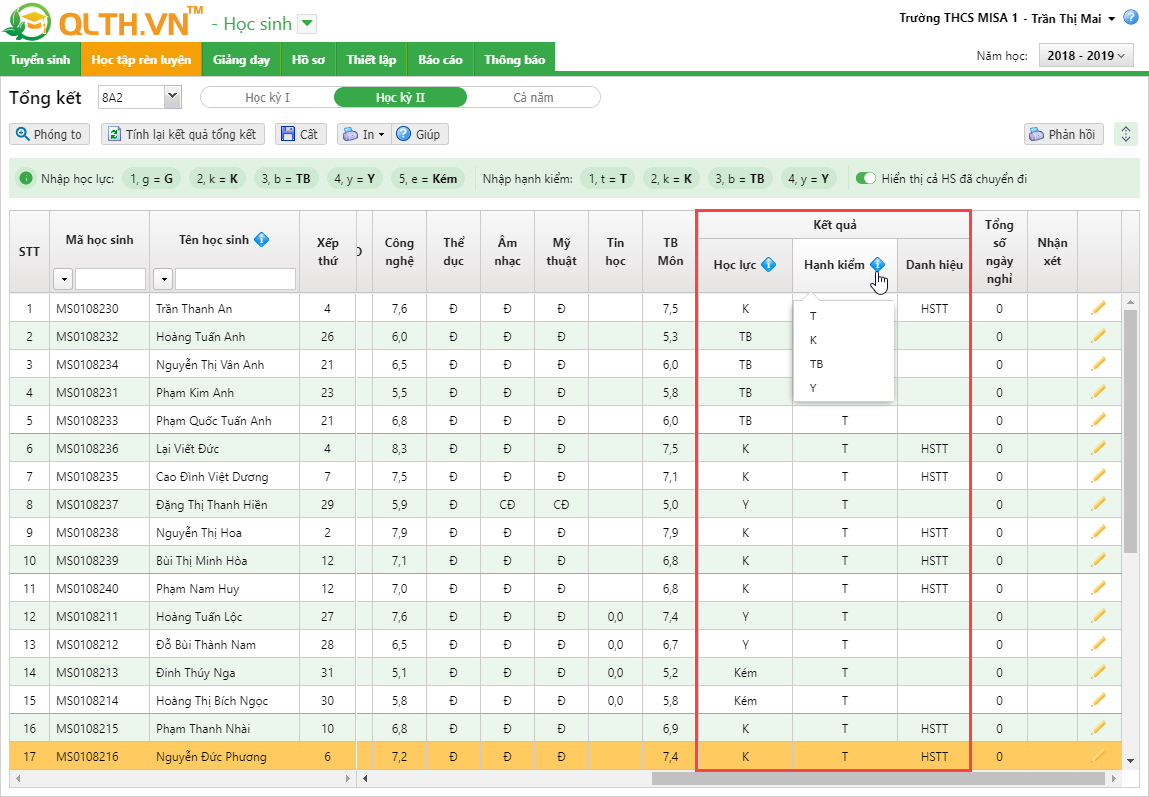 : Tại phần Kết quả – Học lực và Hạnh kiểm anh/chị có thể nhấn vào tiêu đề cột để chọn xếp loại cho toàn bộ học sinh trong lớp. Phần mềm đã đưa ra 1 số kí tự giúp anh.chị có thể nhập nhanh kết quả cho các học sinh trong lớp.
