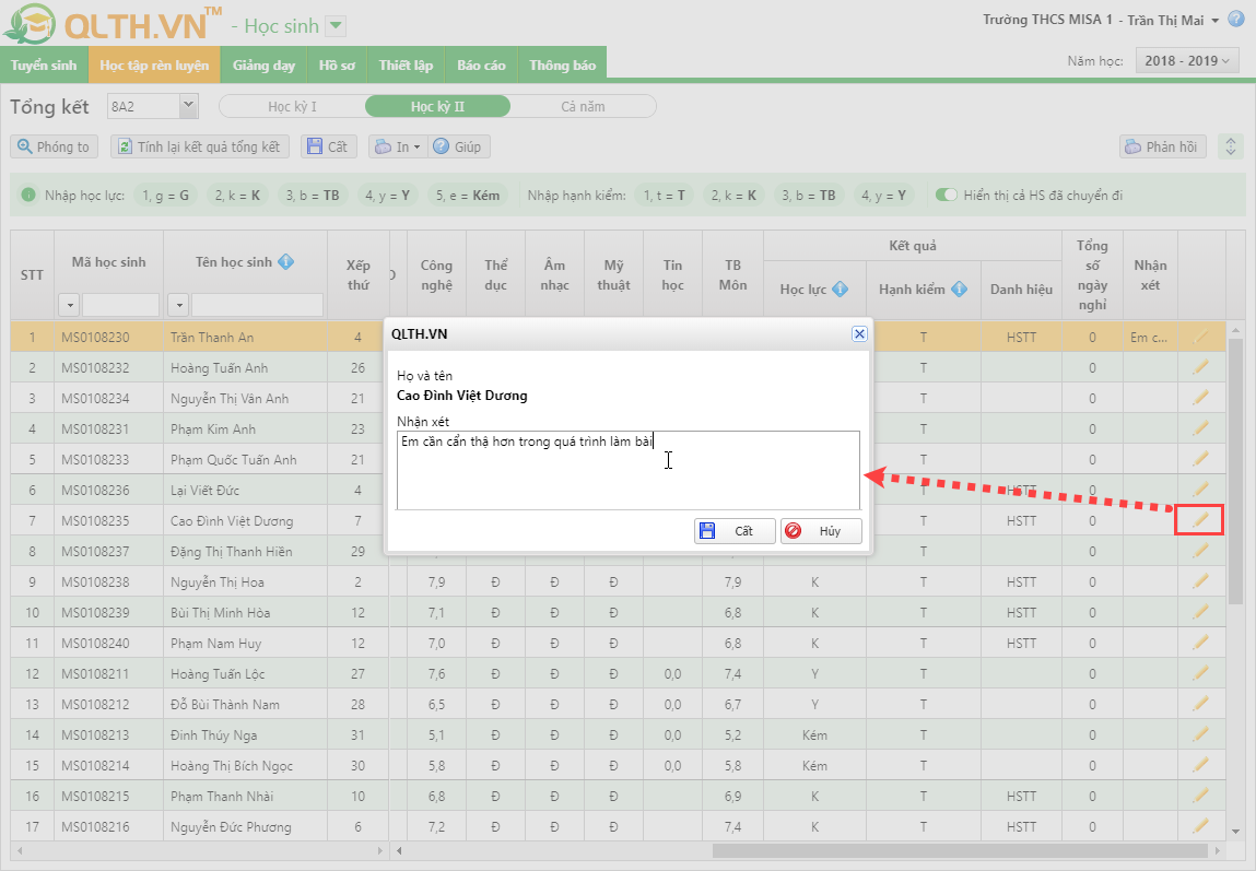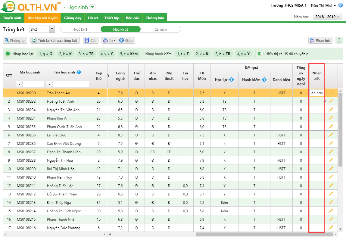 • Nhập trực tiếp tại cột Nhận xét để nhập nhận xét cho học sinh.