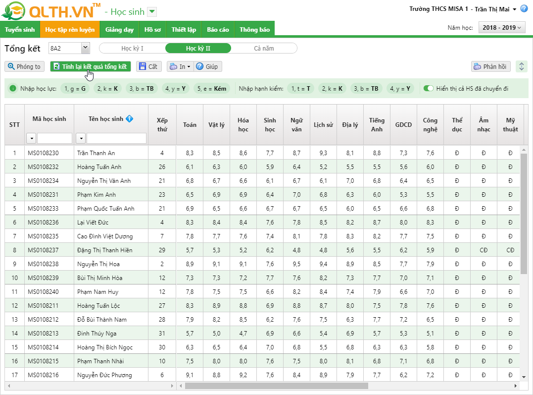 2. Nếu giáo viên có thực hiện sửa lại thông tin trên Sổ điểm cá nhấn thì anh/chị nhấn Tính lại kết quả tổng kết để phần mềm tính lại kết quả tổng kết cho học sinh
