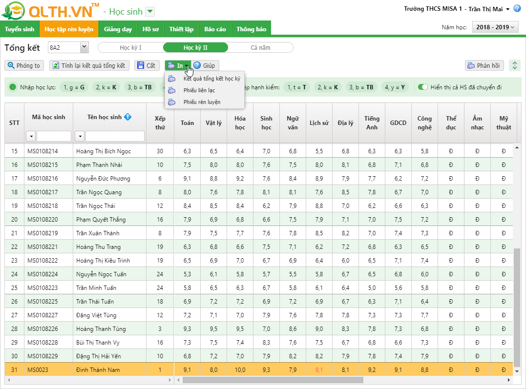 • Tại đây, phần mềm đã tự động thực hiện tổng kết cho toàn bộ học sinh trong lớp theo tiêu chí: