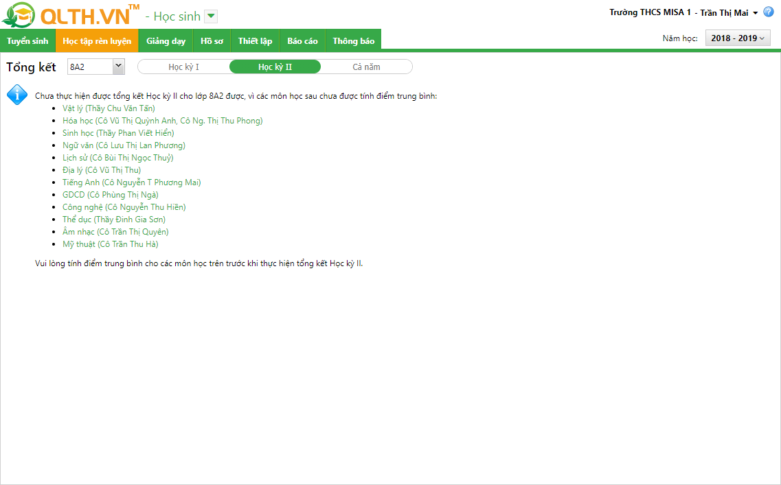 • Chọn Lớp thực hiện tổng kết học kỳ II. Lưu ý: Trường hợp các môn chưa được tính điểm TB môn thì phần mềm sẽ hiển thị thông báo để GV biết.