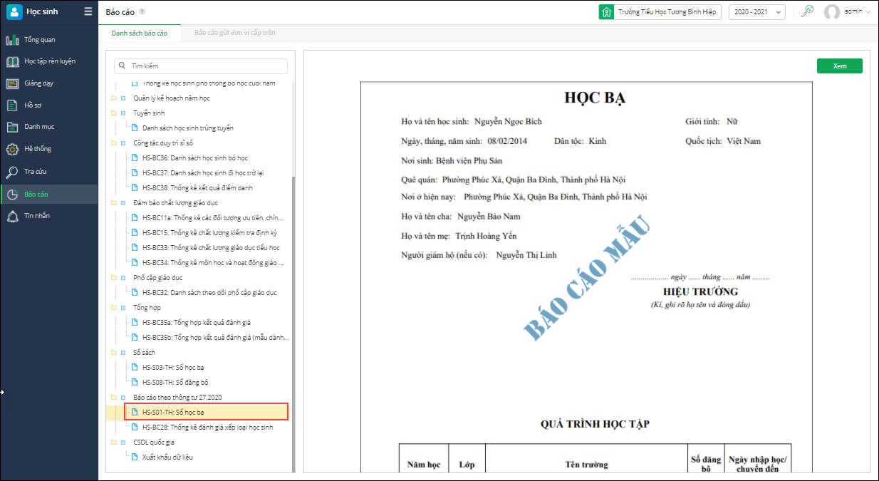1. Vào Học sinh\Báo cáo\Báo cáo theo thông tư 27.2020\HS-S01: Sổ học bạ