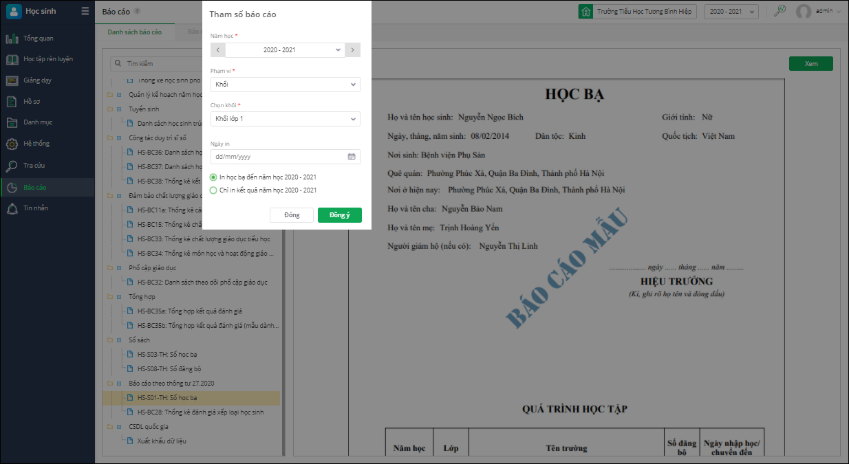 3. Khai báo các tham số: Lựa chọn năm học, Phạm vi, khối lớp, Ngày in.
