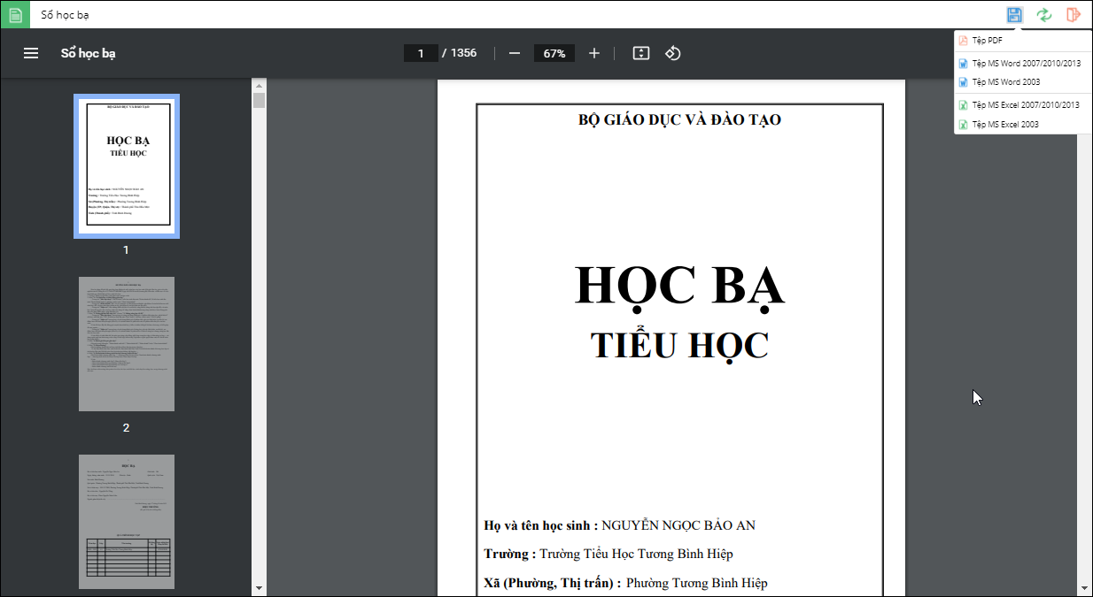 1. Nhấn Đồng ý, nhấn vào biểu tượng này để xuất sổ học bạ ra định dạng excel, word,..