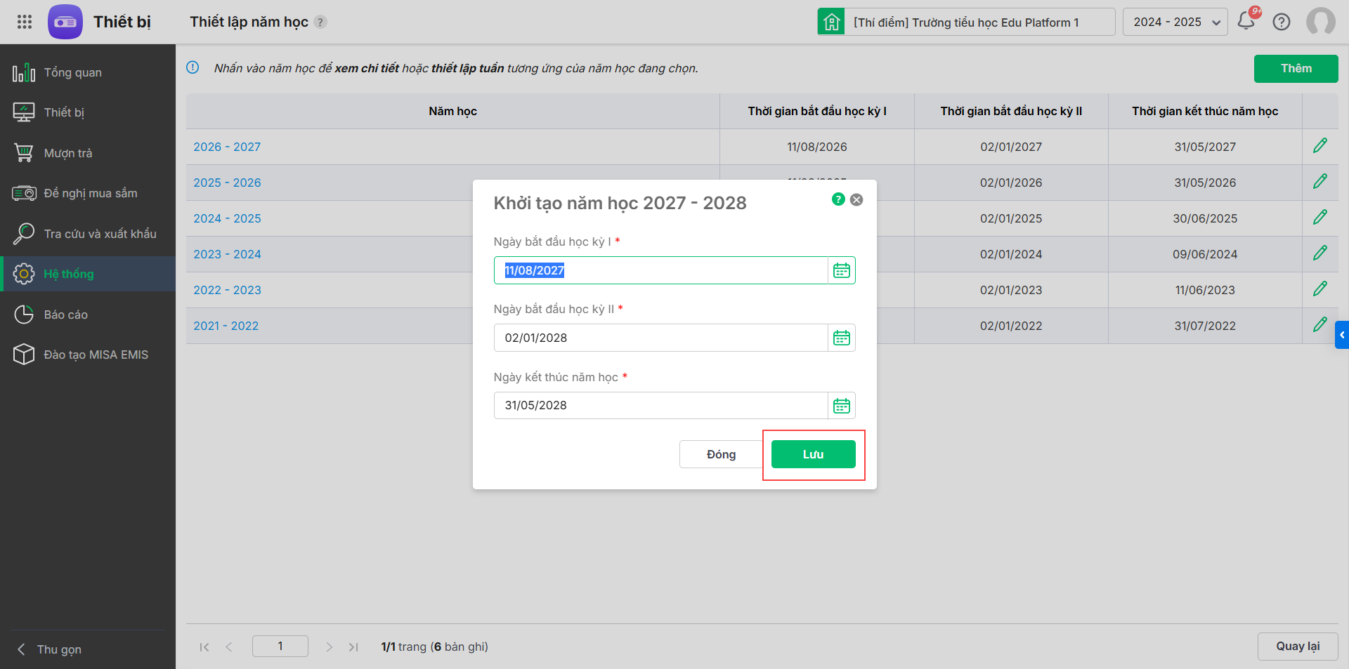 - Nhấn Lưu để lưu năm học mới.