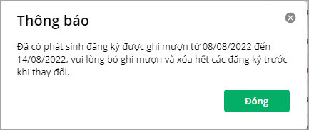 - Trường hợp đã phát sinh dữ liệu mượn trả thiết bị/kho phòng trong khoảng thời gian năm học bị thay đổi, phần mềm hiển thị thông báo như dưới đây. Anh/chị vui lòng làm theo hướng dẫn để không bị ảnh hưởng đến các dữ liệu đã phát sinh.