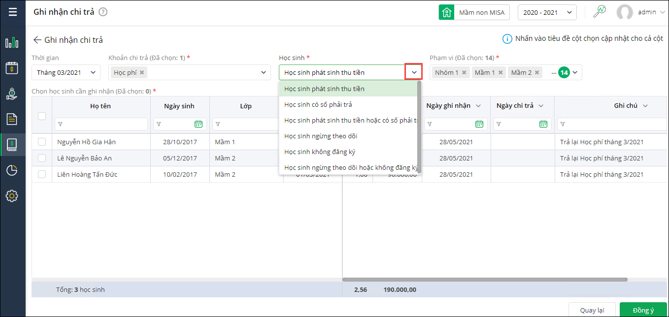 - Tích chọn những học sinh cần ghi nhận chi trả.