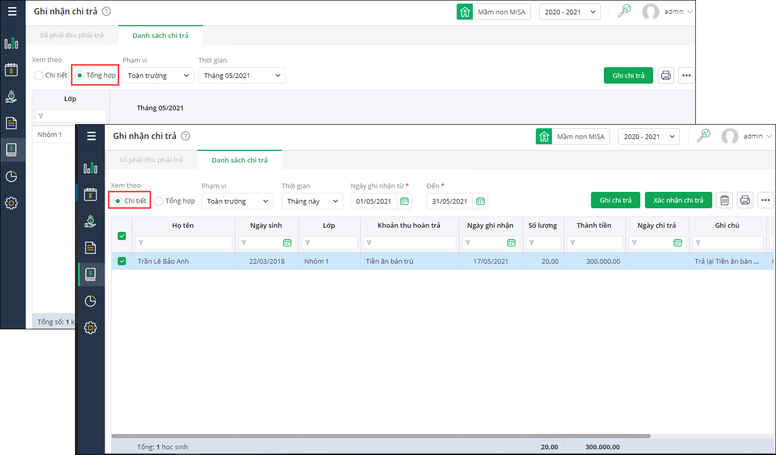 - Xem theo chi tiết: xem chi tiết tình hình chi trả của từng học sinh theo phạm vi đã chọn.