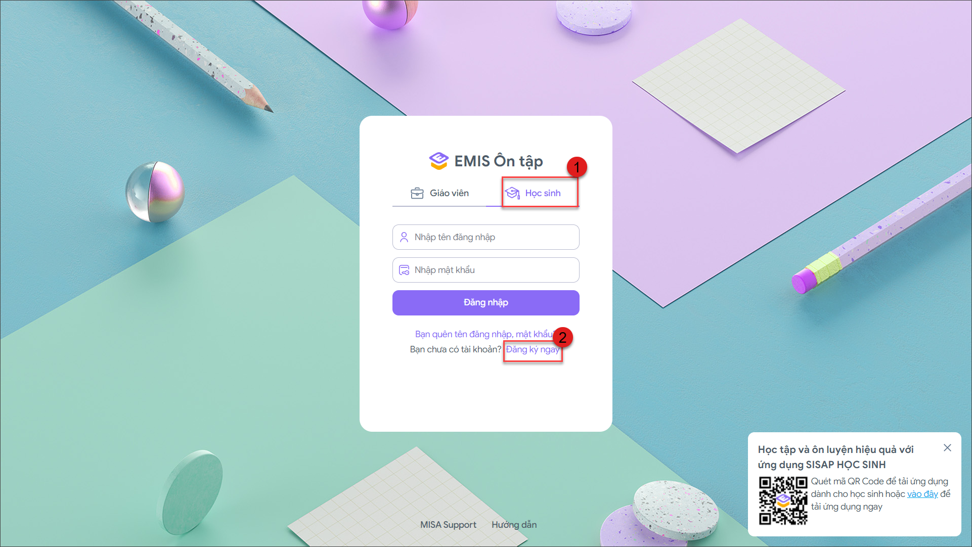 Để đăng ký tài khoản EMIS Ôn tập, các bạn thực hiện như sau:
