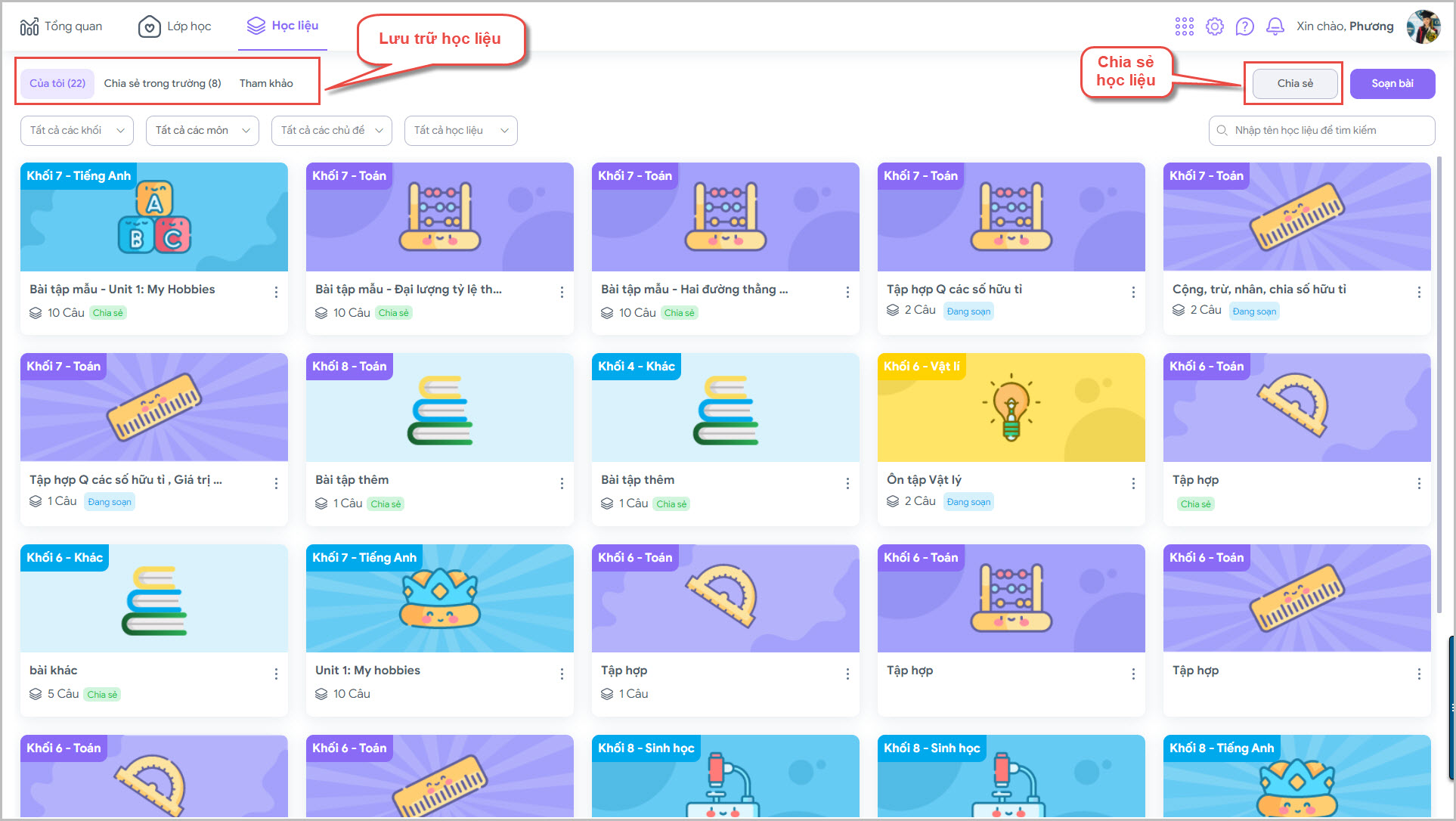 Giáo viên có thể chia sẻ lên cộng đồng giáo viên cho giáo viên khác (xem hướng dẫn tại đây) hoặc tham khảo học liệu của các giáo viên khác chia sẻ (xem hướng dẫn tại đây)
