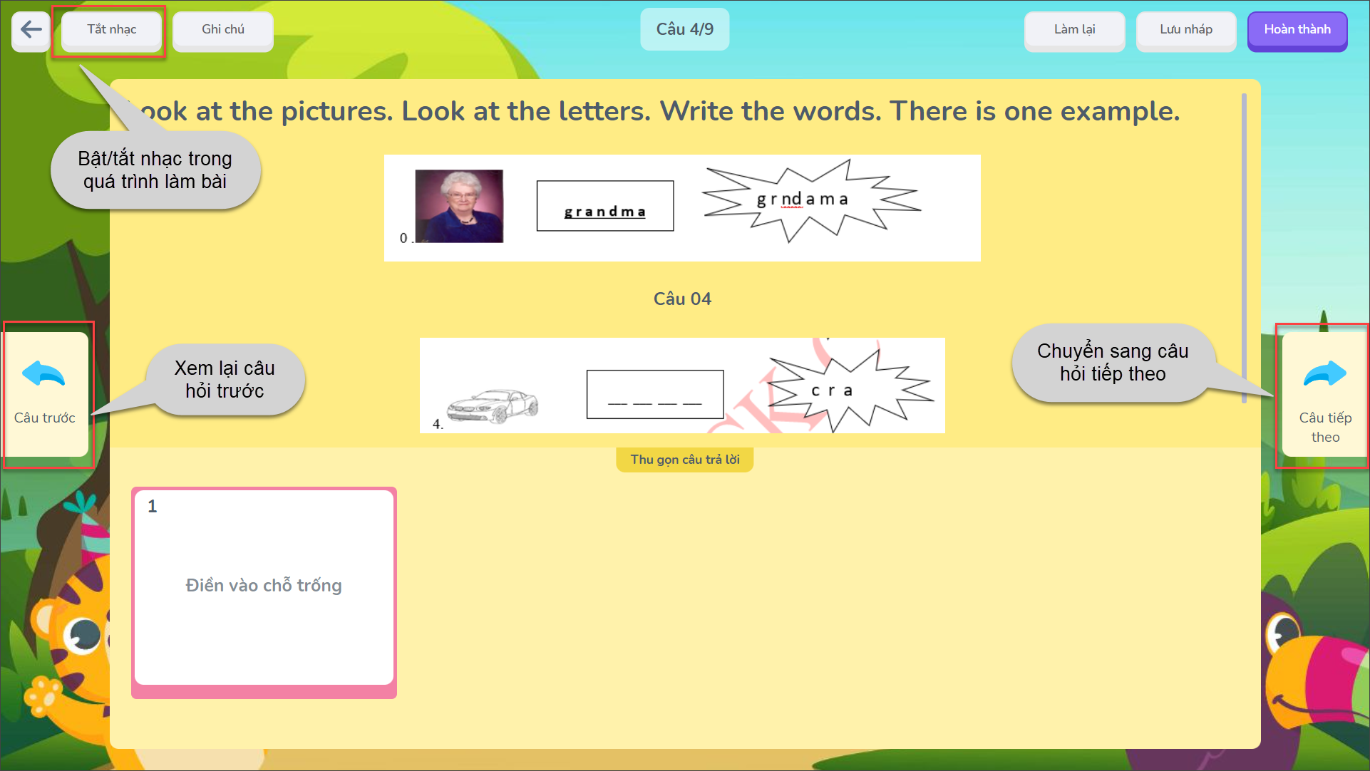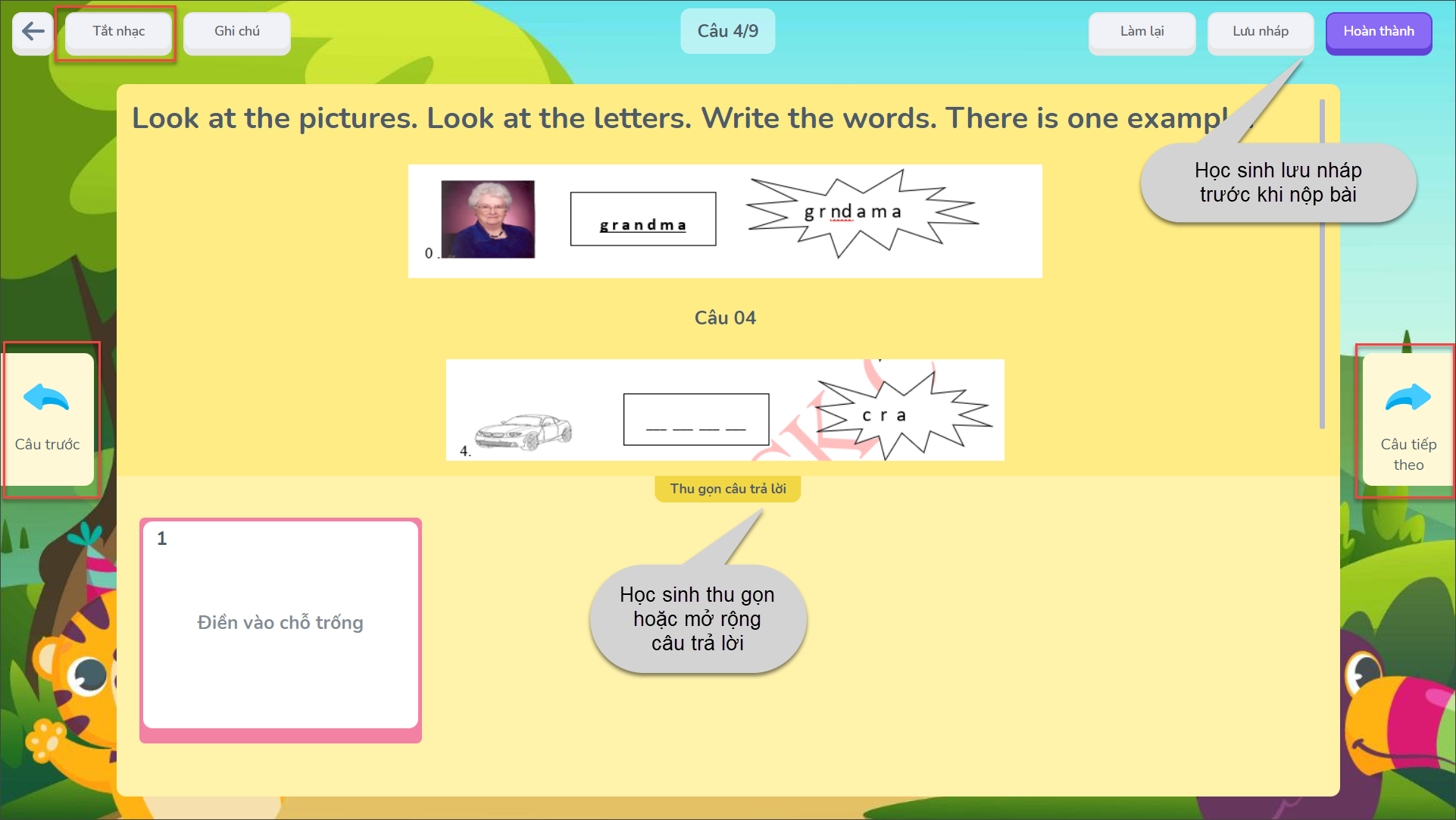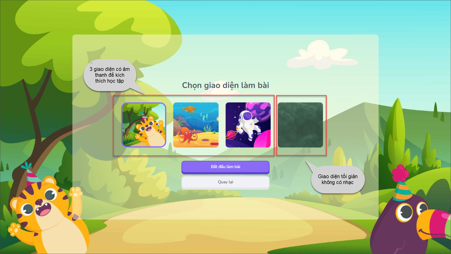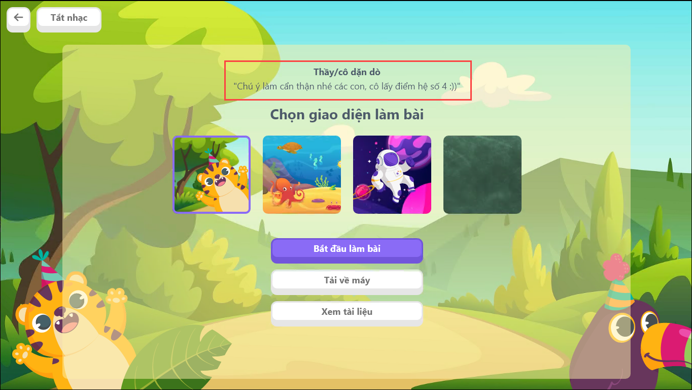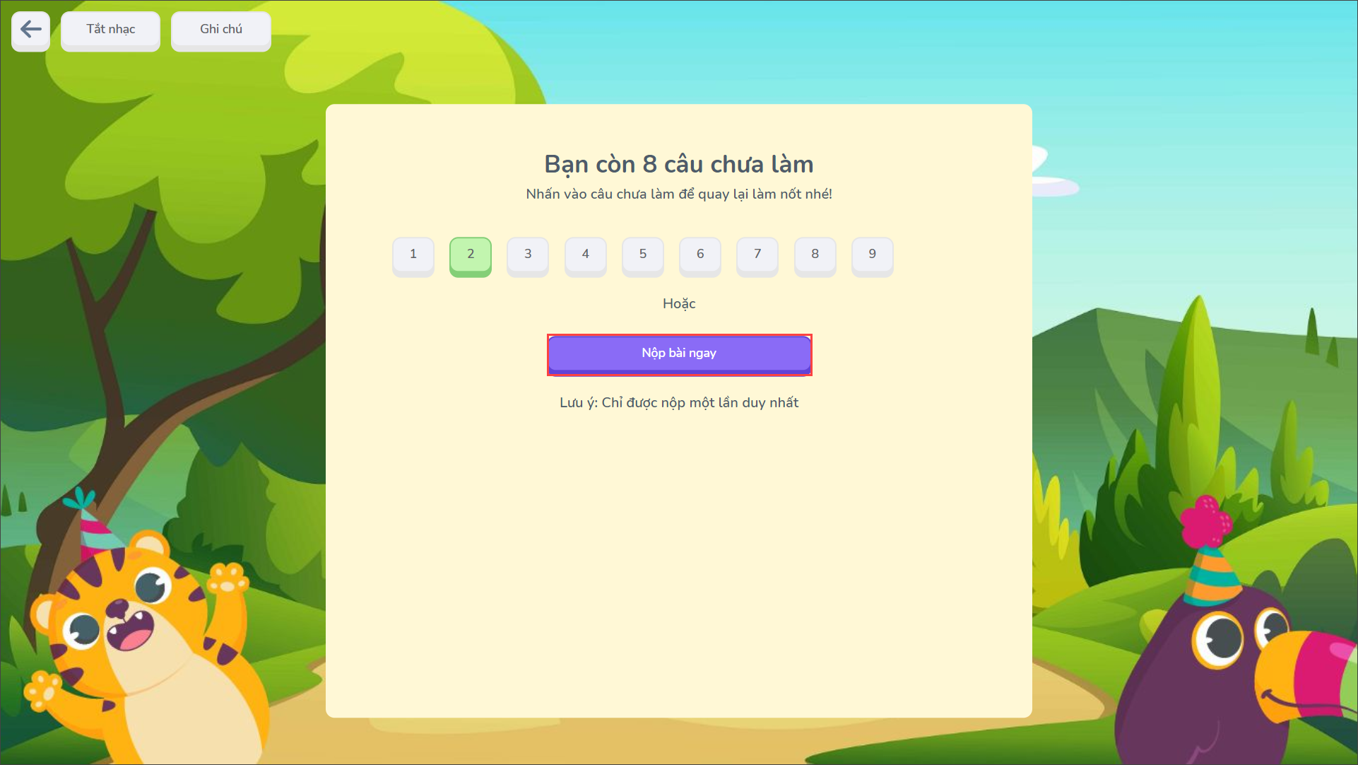 - Trong quá trình làm bài, học sinh có thể tắt/bật nhạc tùy ý.