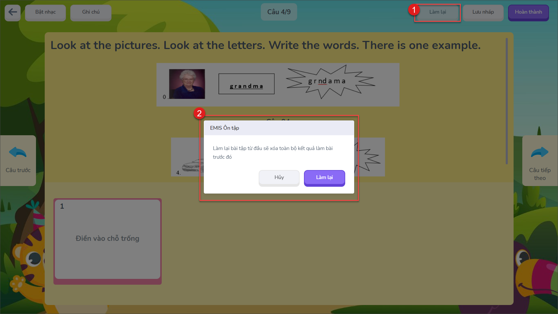 - Nếu học sinh chọn làm lại bài, phần mềm sẽ hiện lên thông báo để học sinh chọn trước khi Hủy hoặc Làm lại.