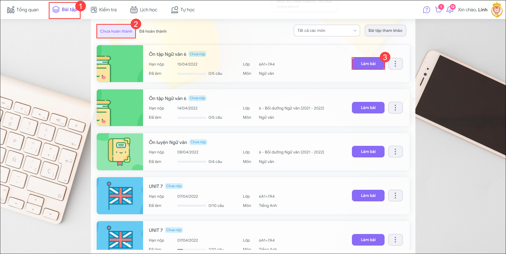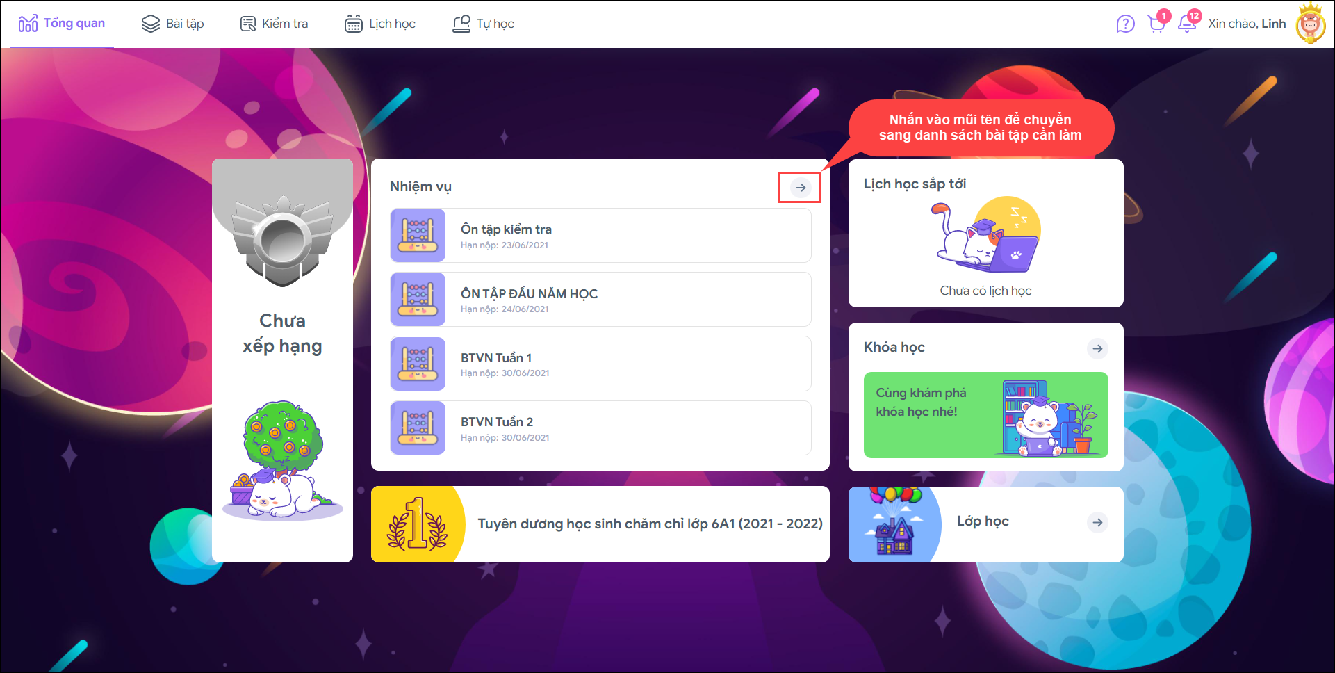 - Trên màn hình giao diện Tổng quan, học sinh sẽ nhìn thấy Nhiệm vụ mình cần làm, học sinh nhấn vào bài tập cần làm hoặc mũi tên điều hướng sang danh sách bài tập.