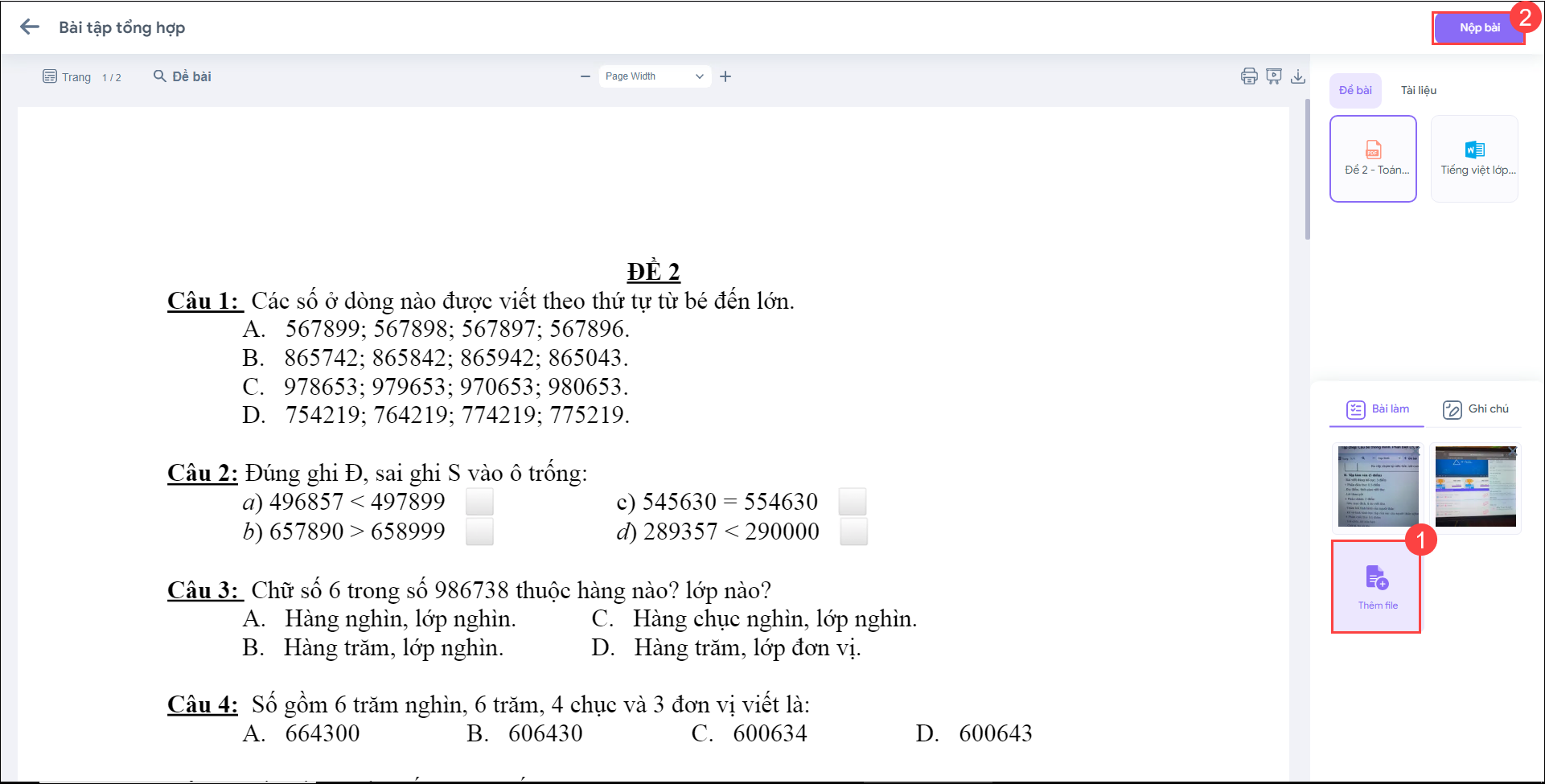 - Dạng câu trả lời tự luận, học sinh có thể chụp ảnh và kéo thả file hình ảnh và nhấn Nộp bài để gửi bài cho giáo viên.