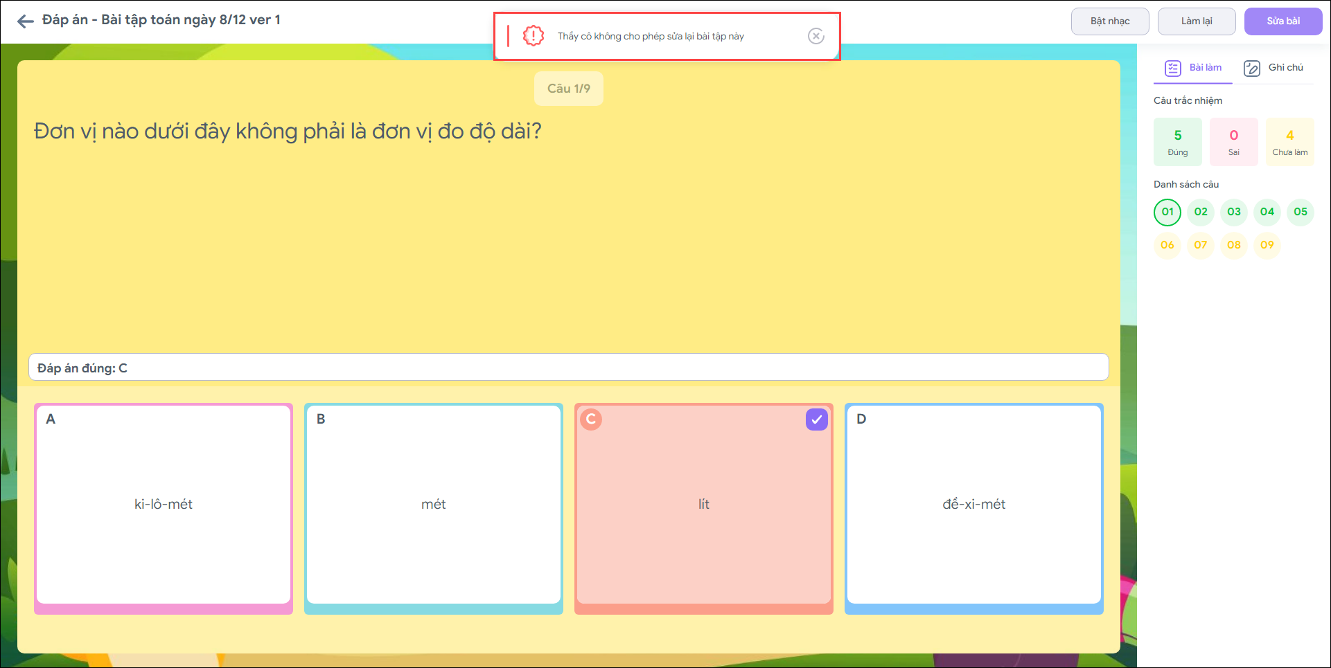 2. Trường hợp Giáo viên không cho phép Học sinh chỉnh sửa bài tập, màn hình hiển thị thông báo như sau: