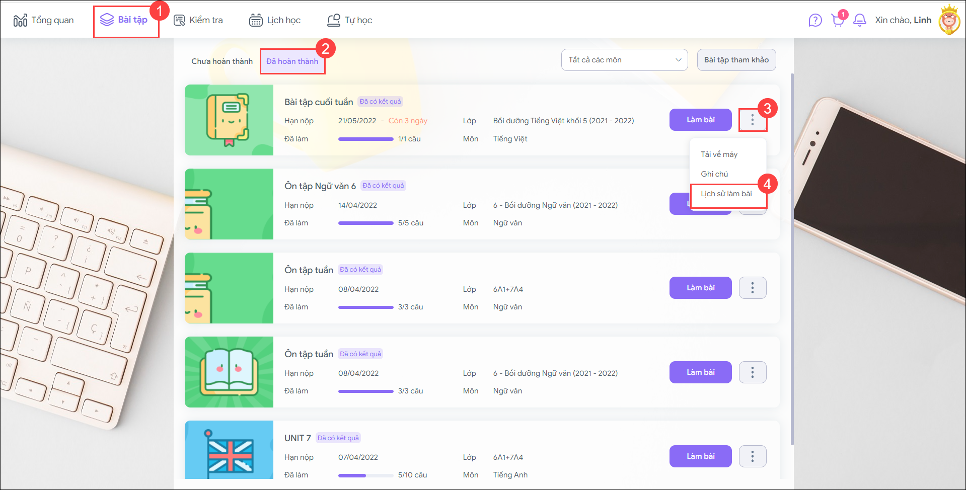 - Vào Bài tập, chọn Đã hoàn thành. Tại bài tập cần chỉnh sửa, chọn Lịch sử làm bài.