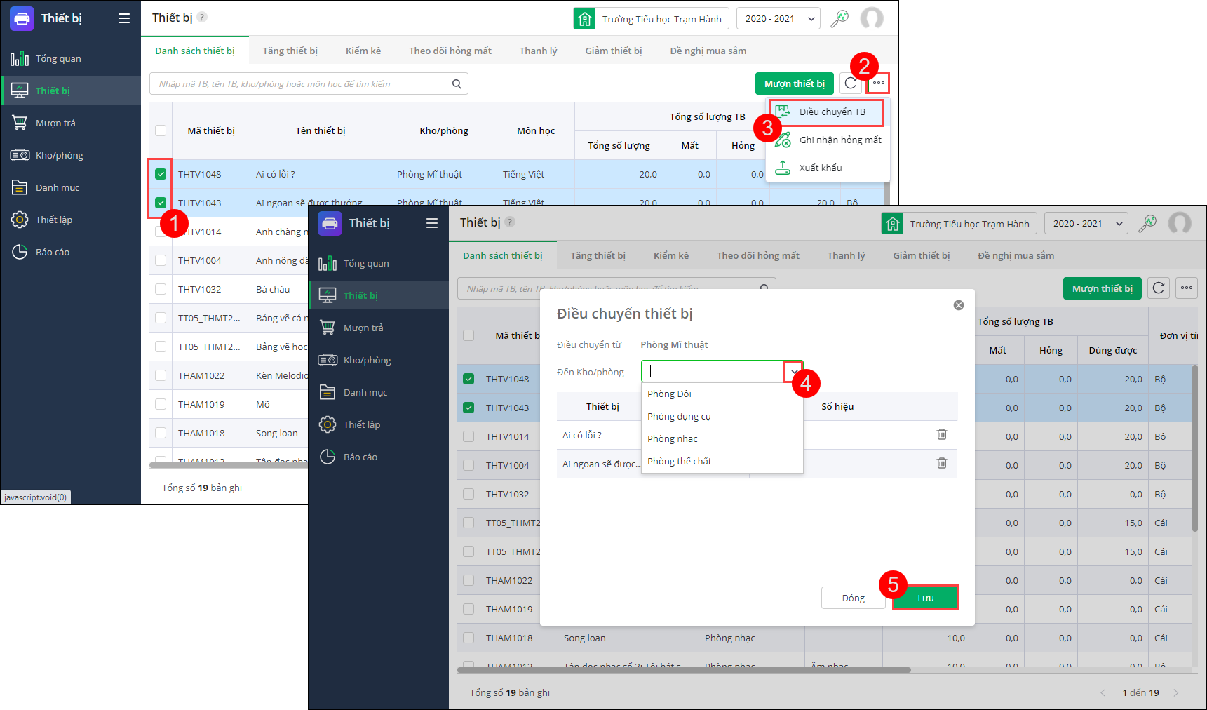 - Chọn Kho/phòng thiết bị chuyển đến. Nhấn Lưu