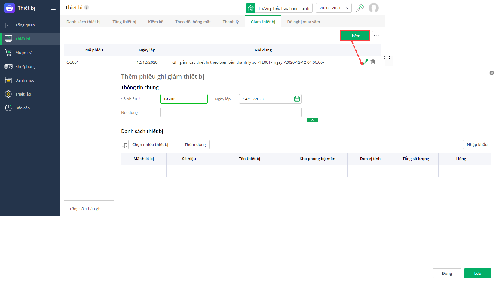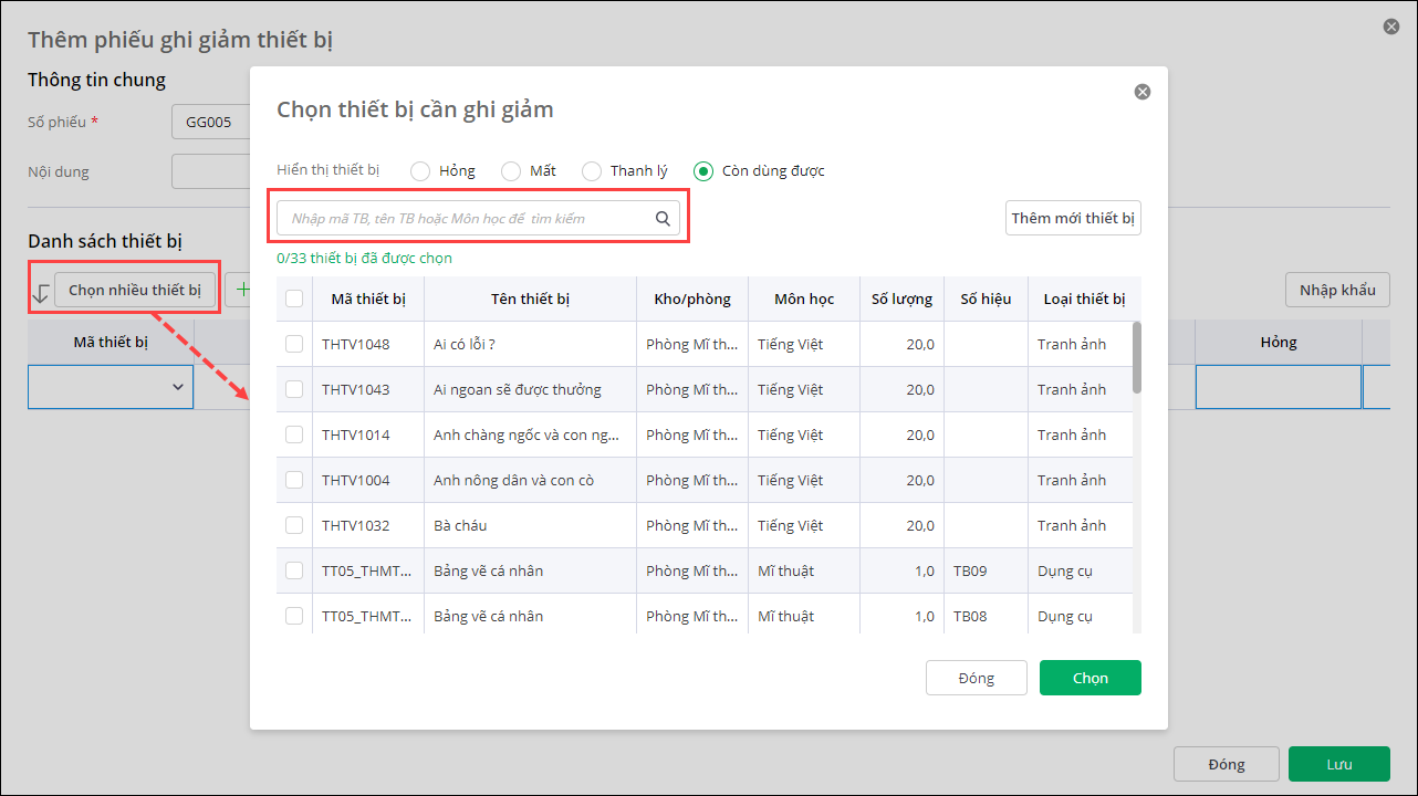 1. Vào Thiết bị (New)\Thiết bị\Giảm thiết bị.