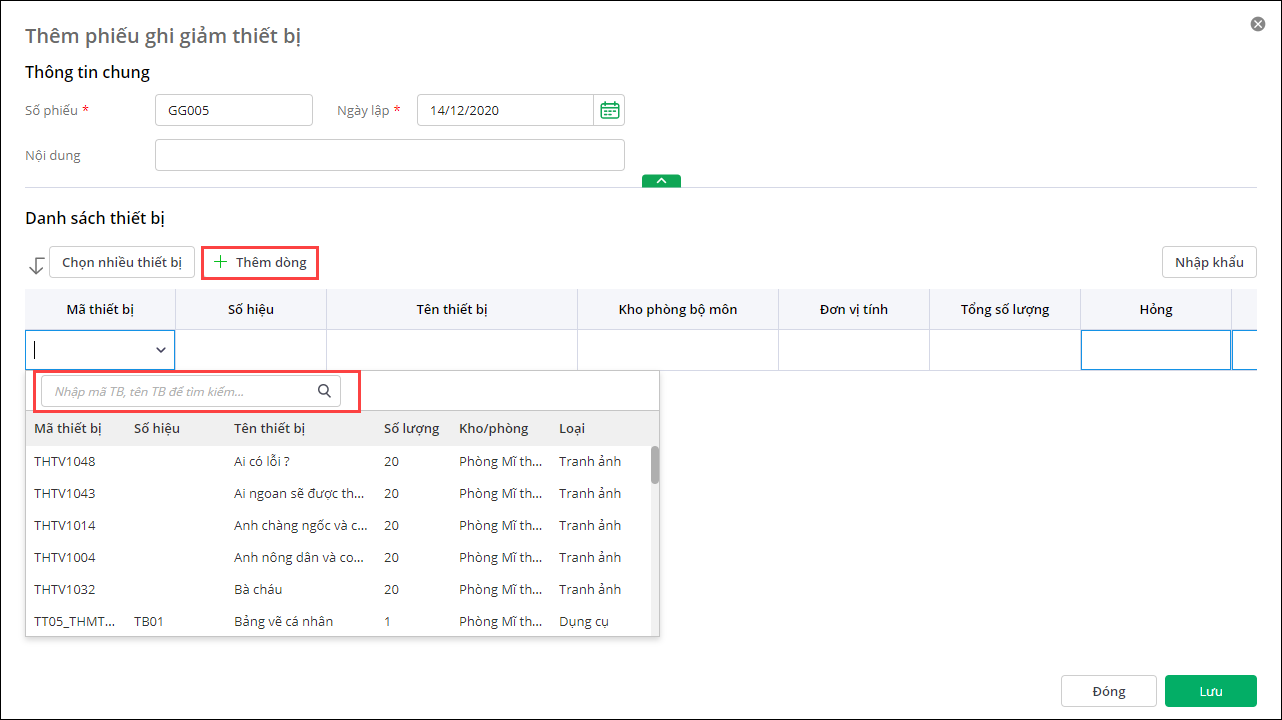 2. Khai báo các thông tin về chứng từ ghi giảm thiết bị: số phiếu, ngày lập, nội dung