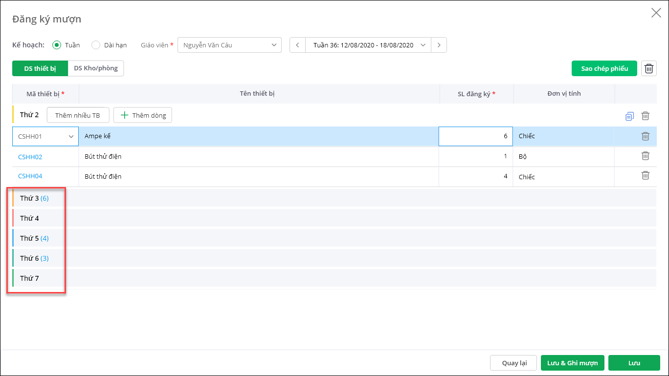 3. Tại bước lập kế hoạch mượn, anh /chị theo dõi số lượng thiết bị mượn theo từng thứ như dưới đây.