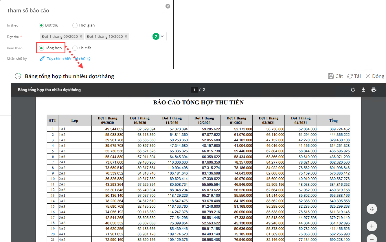 • Xem theo Tổng hợp: xem thông tin thu tiền của tất cả các khoản thu thuộc đợt thu đã chọn trong phạm vi toàn trường
