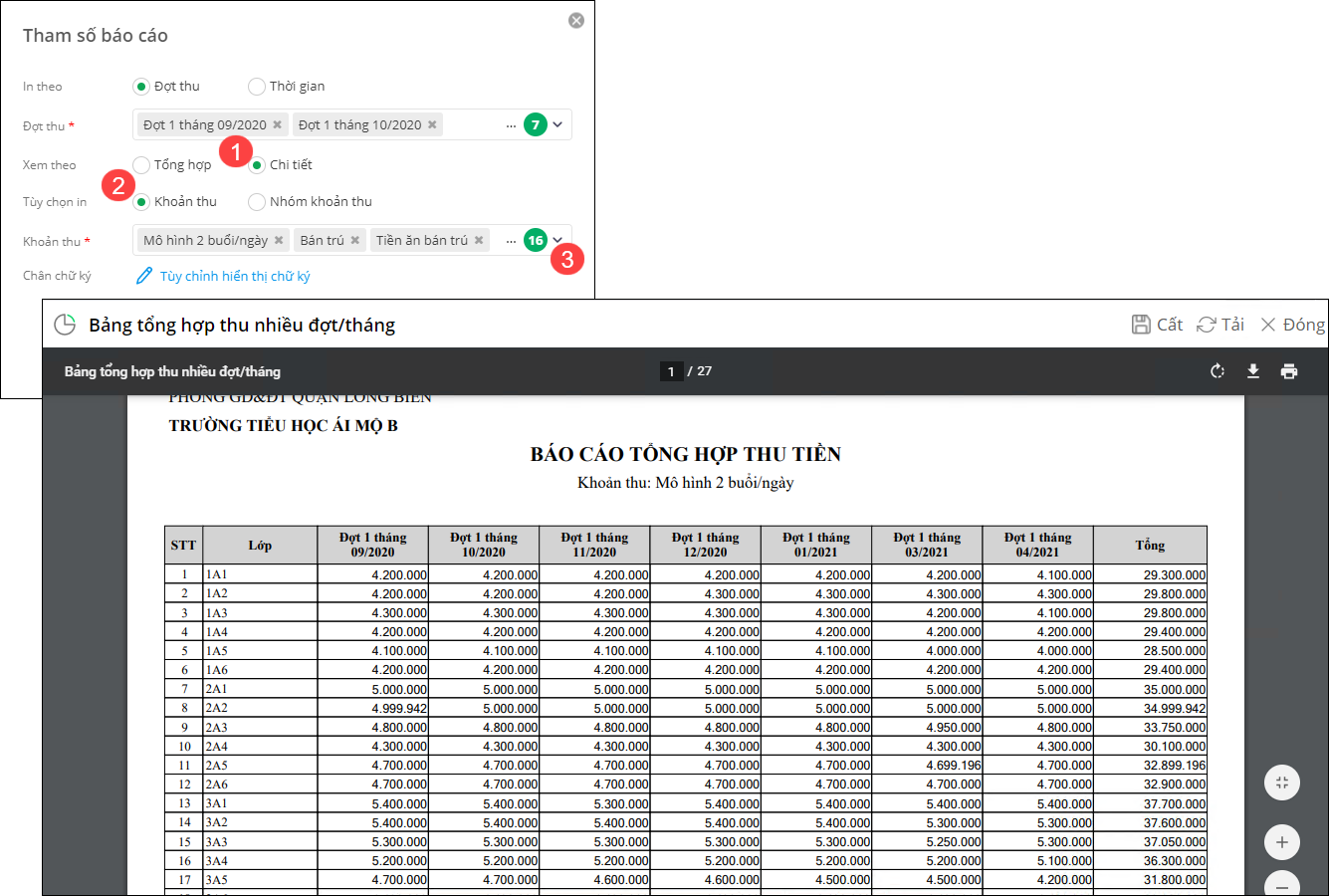 • Xem theo Chi tiết: xem thông tin thu tiền của từng khoản thu/Nhóm khoản thu thuộc tháng đã chọn trong phạm vi toàn trường, mỗi khoản thu/nhóm khoản thu 1 báo cáo.