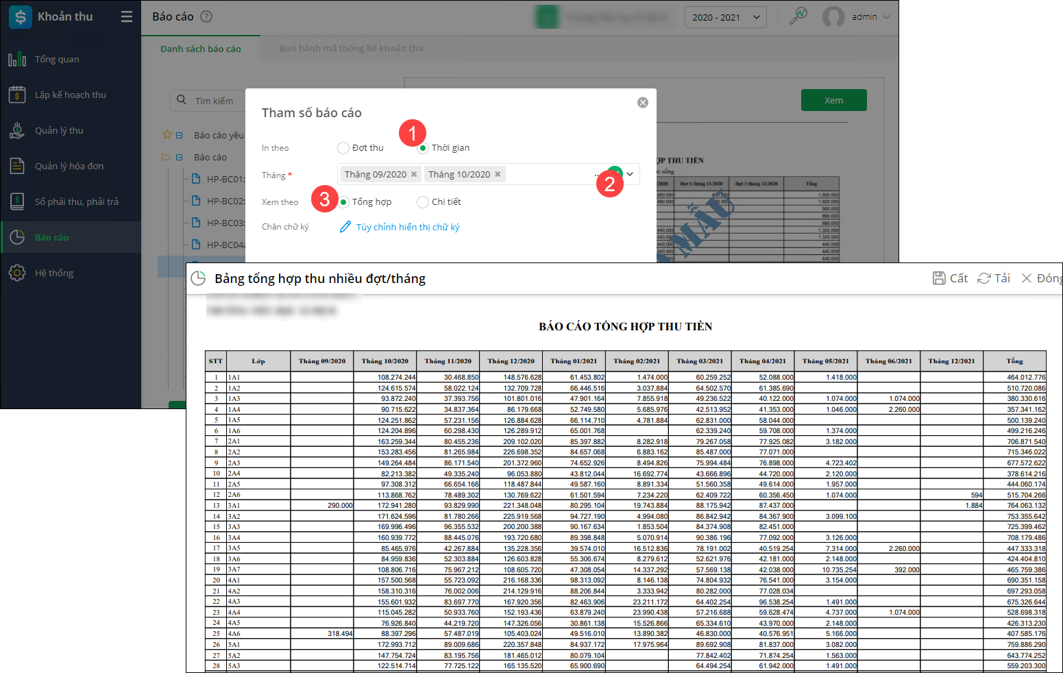 3. Anh/chị in báo cáo theo đợt thu hoặc thời gian: