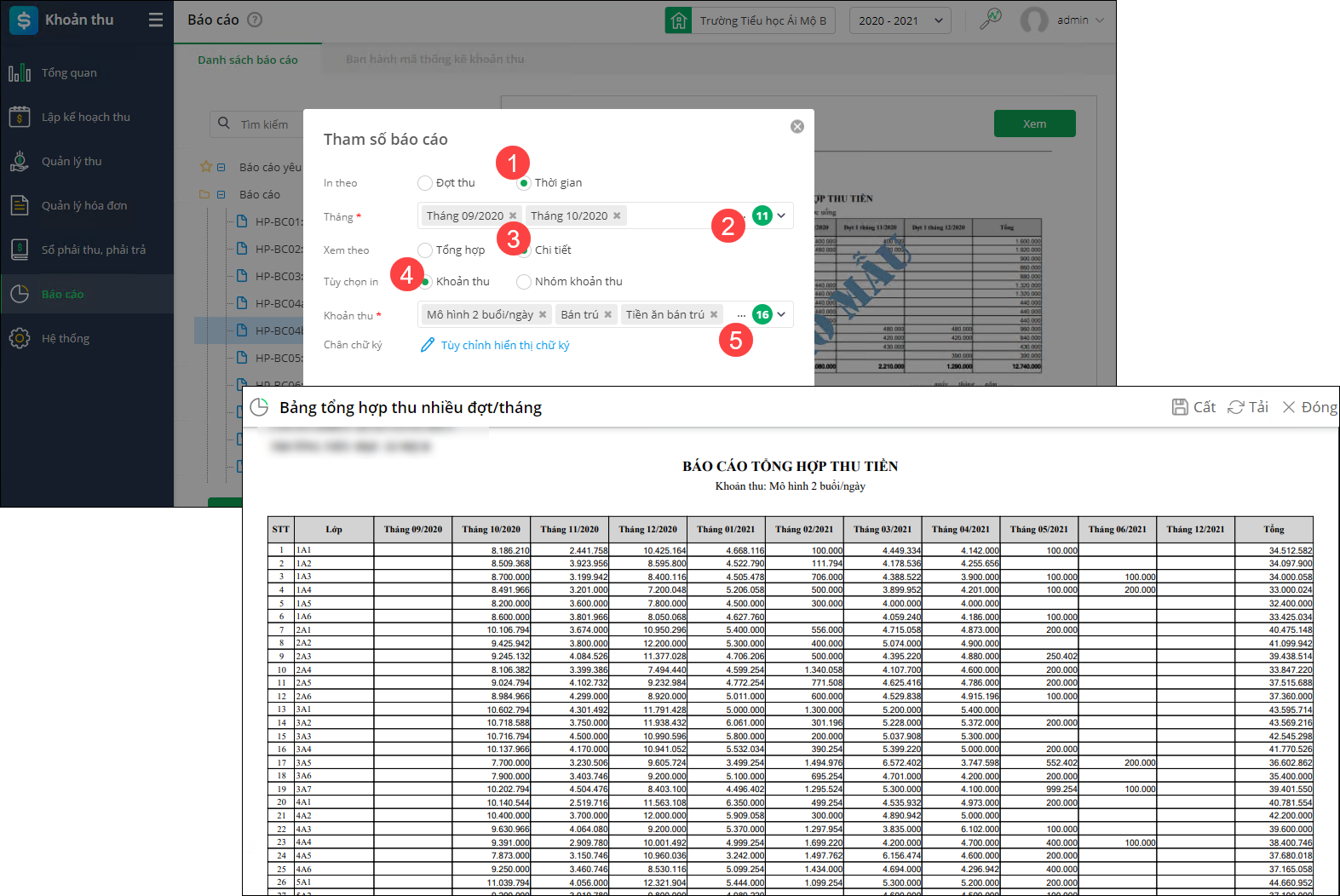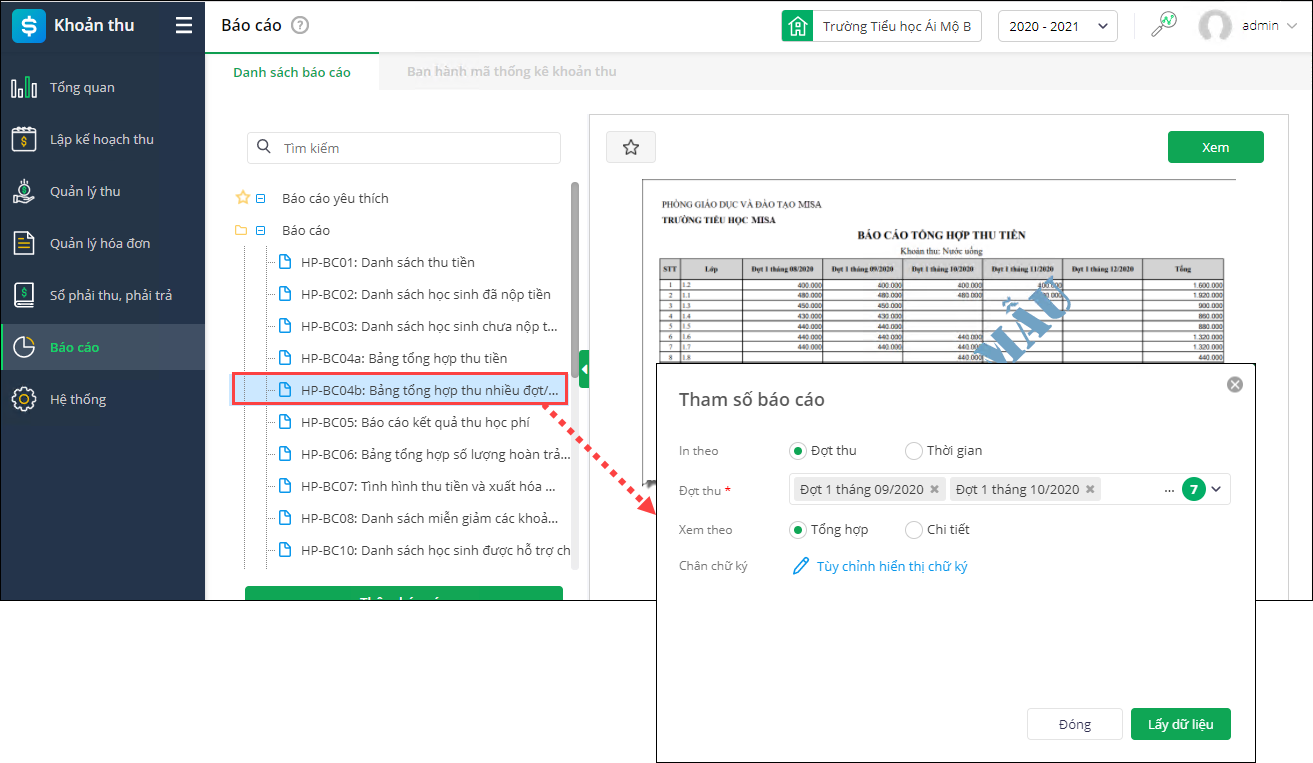 1. Vào Khoản thu\Báo cáo\Danh sách báo cáo\HP-BC04B: Bảng tổng hợp thu nhiều đợt/tháng
