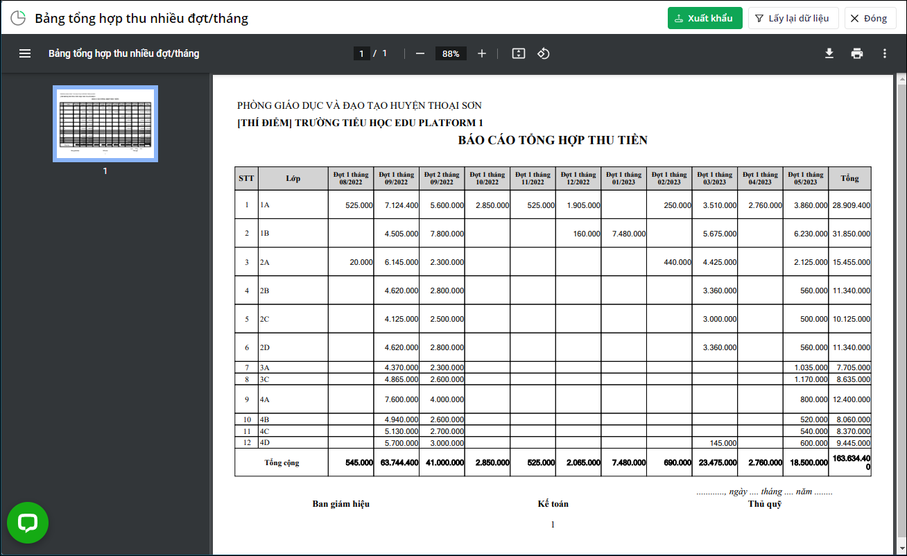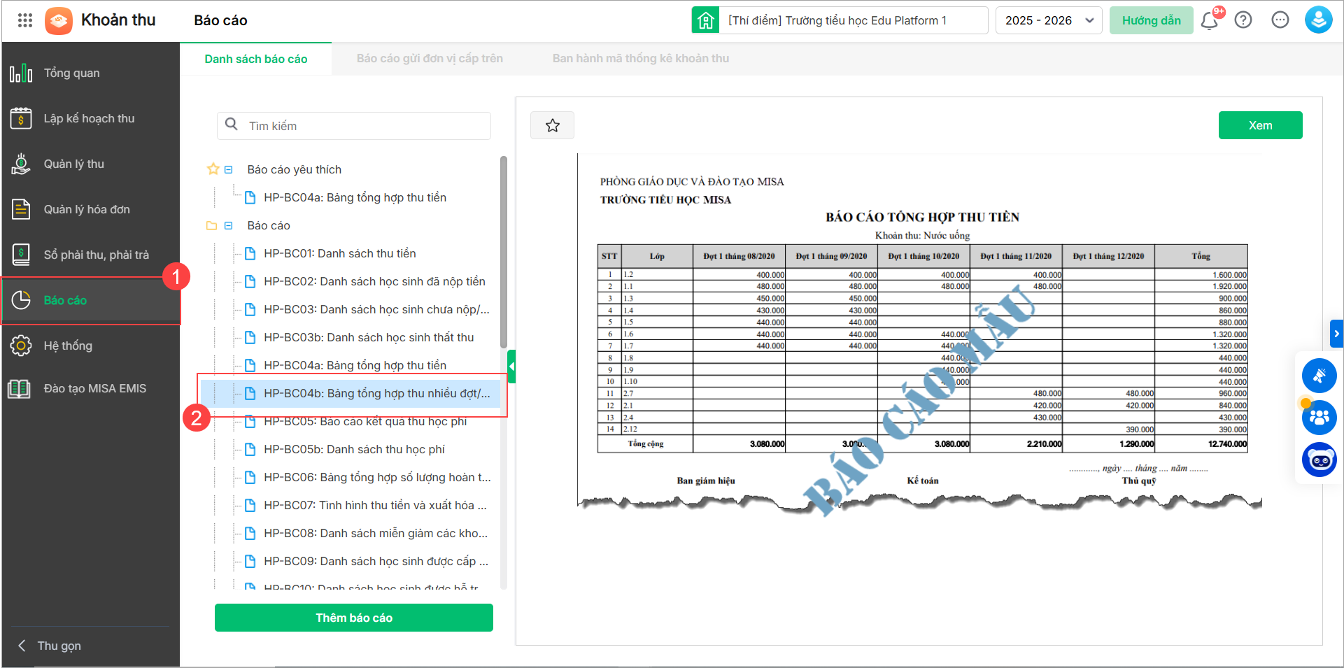 - Vào Khoản thu\Báo cáo\Danh sách báo cáo\HP-BC04b: Bảng tổng hợp thu nhiều đợt/tháng
