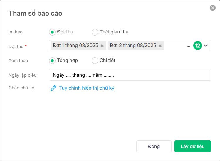- In theo: Đợt thu hoặc Thời gian thu. Chọn đợt thu/thời gian thu tương ứng.
