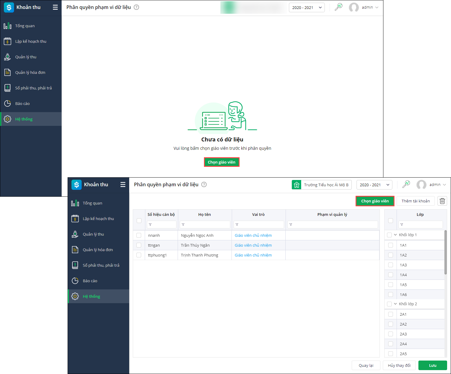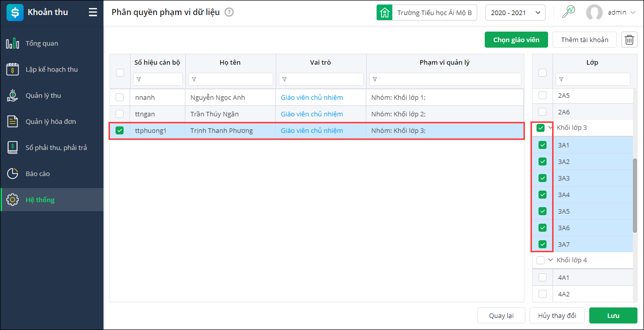 - Với từng giáo viên, anh/chị tích chọn Khối/ lớp mà giáo viên đó quản lý (xem, sửa dữ liệu)