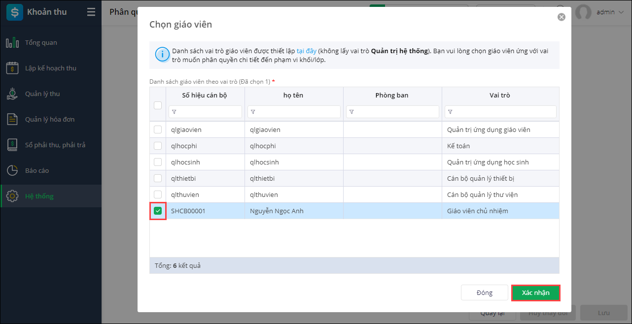 Tích chọn giáo viên cần thiết lập phân quyền chi tiết, nhấn Xác nhận